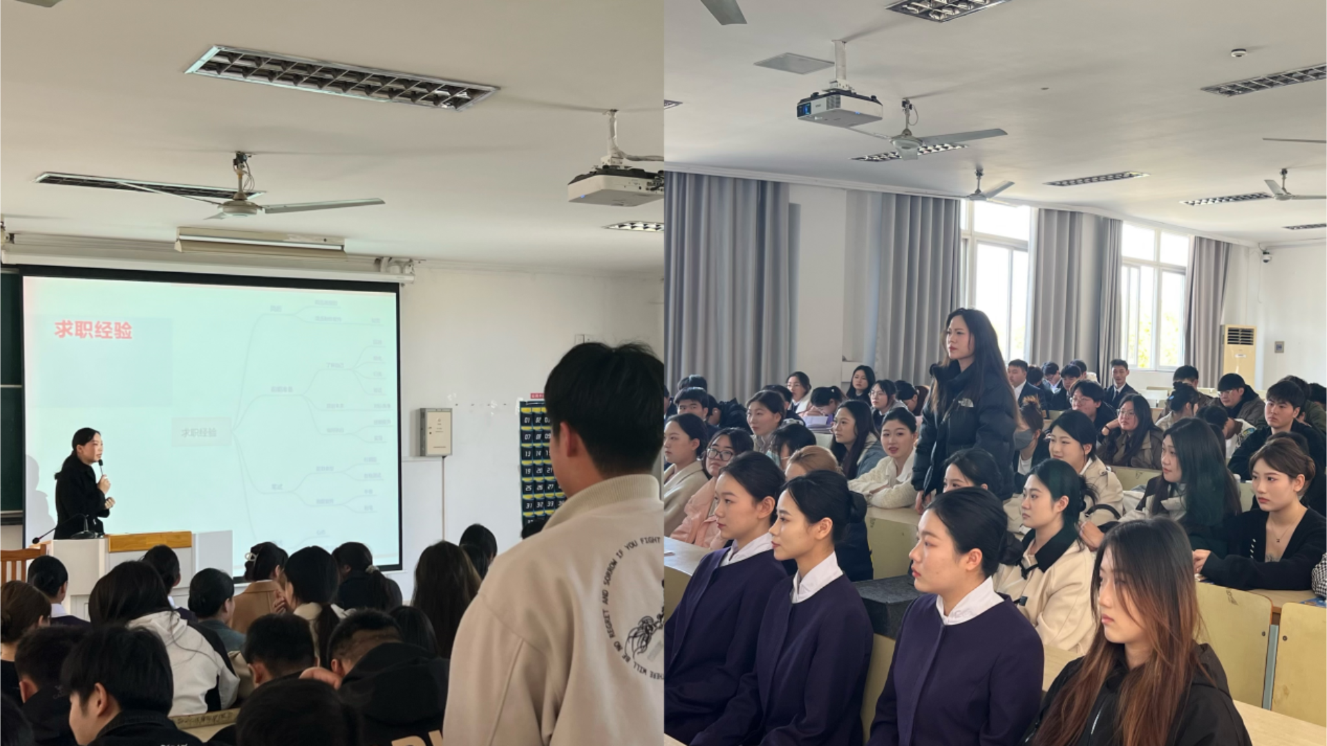 首先,仲经理分享自己的职场经验,提出要提前规划自身的就业方向,树立择业就业的观念并将就业规划进行实践。之后,她向同学们讲解了当下就业现状与时代特征,期望同学们能通过技能提升拓宽自身认识,抓住身边的新型业态和新思路,养成良好的学习习惯。最后,她为同学们展示了求职简历的设计方法与版式、面试技巧等招聘实用知识。