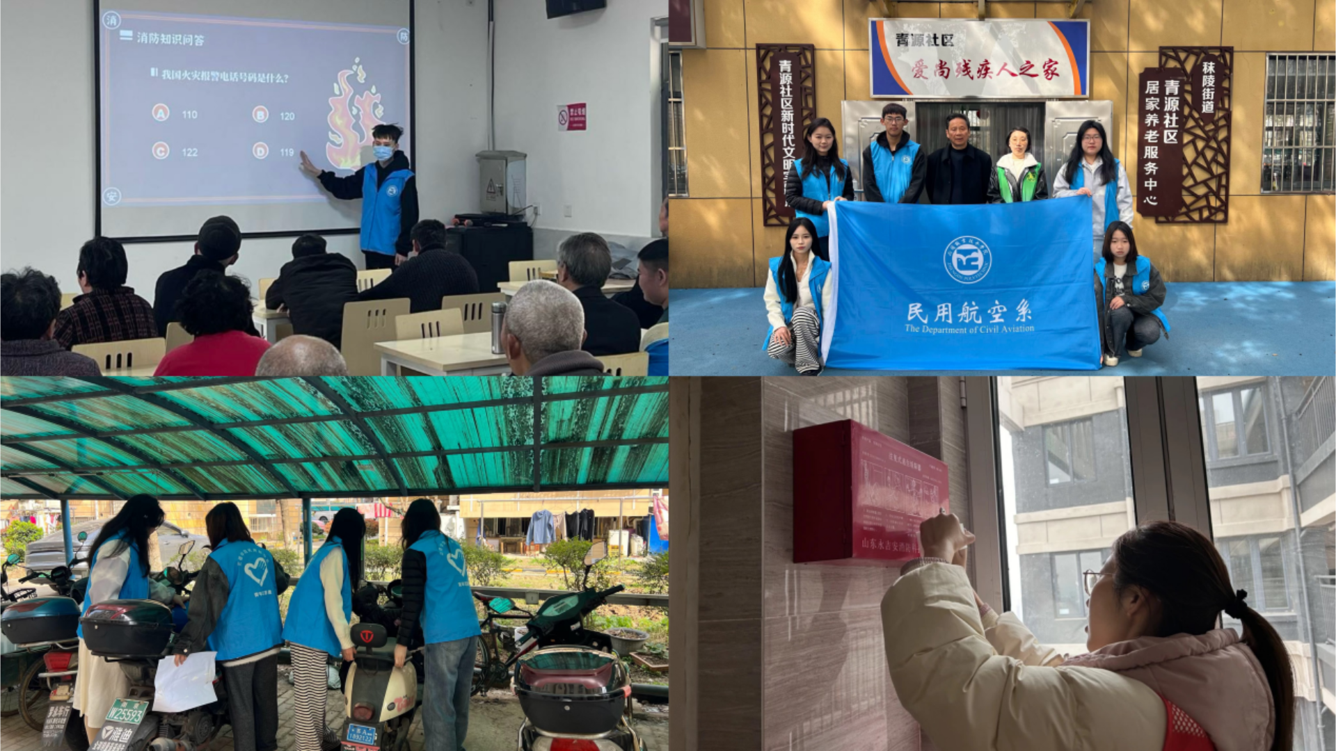 活动现场,民航系学生会执行主席赵佳琦同学为社区居民开展消防安全宣讲。宣讲内容包括火灾的成因、火灾的危害、火灾的预防措施、火灾逃生技巧等。在宣讲的同时,志愿者们向社区居民发放消防宣传资料,包括消防安全手册、安全宣传单、消防应急手册等,让居民更深入地了解消防安全知识和消防隐患自救常识。之后,志愿者们深入社区各场所,如:小区入口和楼梯口等地,他们通过设置标志、标识等安全警示提醒,做到安全宣传全覆盖,全方位的通过语言、文字提醒居民增强消防安全意识,谨防事故发生。