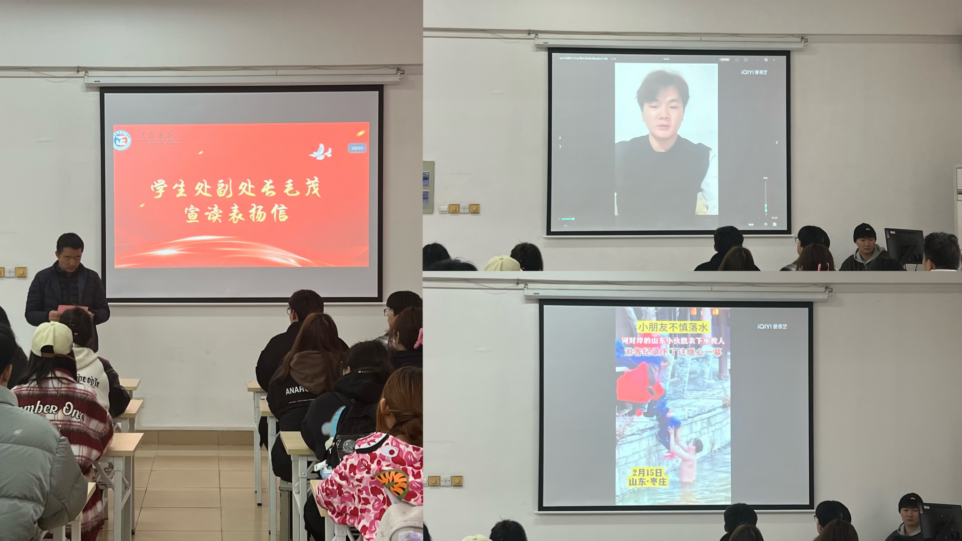 在交流发言现场,辅导员陈瑶瑶老师表示:“作为他的辅导员,在第一时间得知他做这件事时心情非常复杂,一方面担心他会受伤甚至出现意外,另一方面却又为他临危不惧、沉着智慧的救人过程感到欣慰。关键时刻见真章,他始终坚守着心中的本真、善良。赵子明同学能够在关键时刻见义勇为,与父母的养育、学校的教育是密不可分的,用勇于担当的行动展现了正德学生高尚的道德品质和向上向善的精神风貌。”学生代表张俊杰表示:“通过今天的表彰大会,我更加能体会到见义勇为的真正含义,更多的应该是将见义勇为的思想融入到内心,体现在行动,帮助他人,快乐自己!”