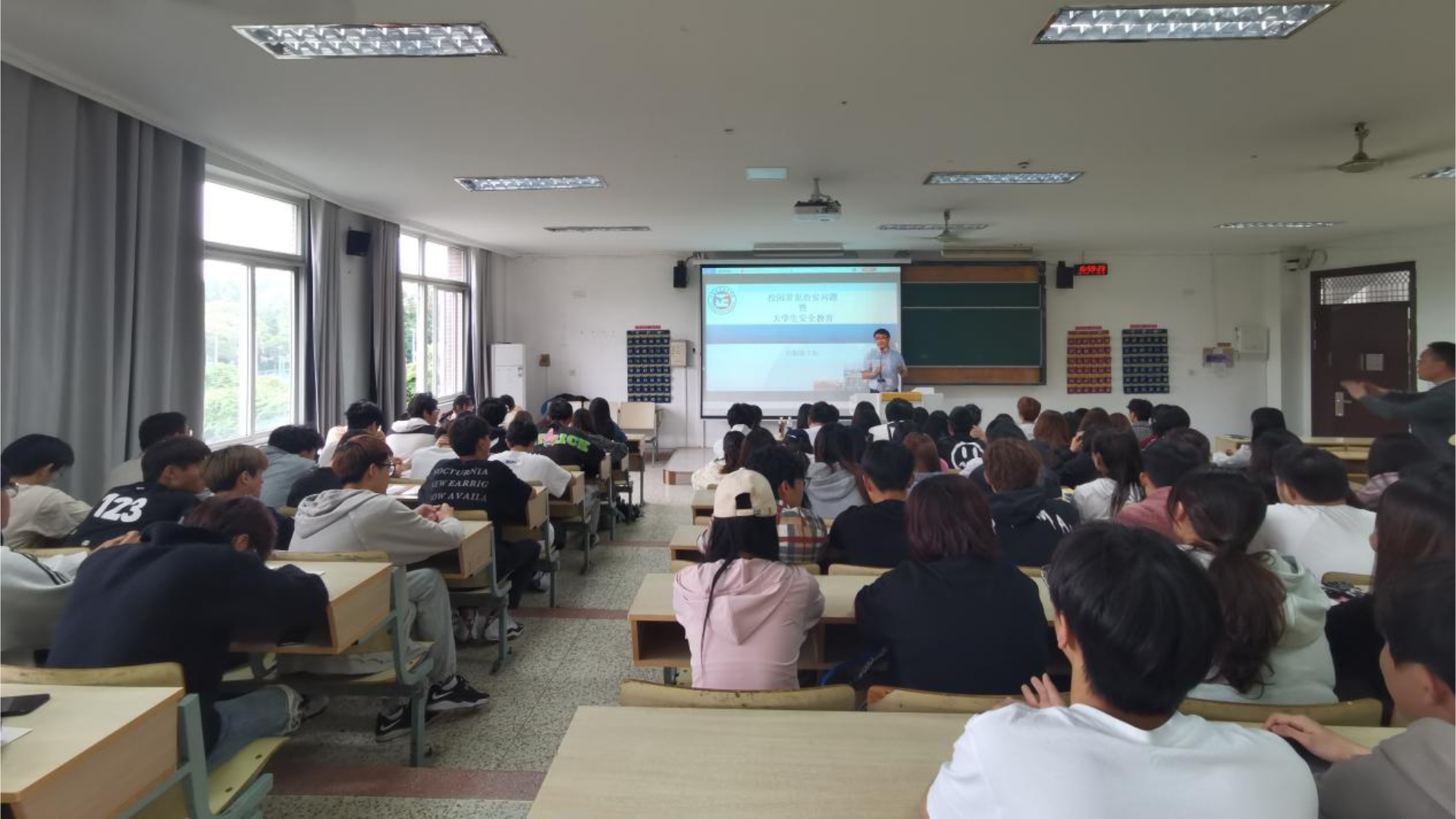 丁处长也强调安全事宜的重要性,他表示,安全工作无小事,必须常抓不懈。随后,他从政治安全、治安交通管理、户籍管理等方面介绍了学校保卫处工作的具体内容,同时又运用生动的案例,向同学们介绍了国家安全、网络诈骗、校园消防各类安全面临的形势和挑战。同时说明了禁止宿舍使用电器、正确使用灭火器材、及时报警、组织疏散等火灾的预防和应急处理措施。他强调,每个人都要把安全知识运用到学习和生活中去,筑牢校园安全防线,确保师生生命财产安全。