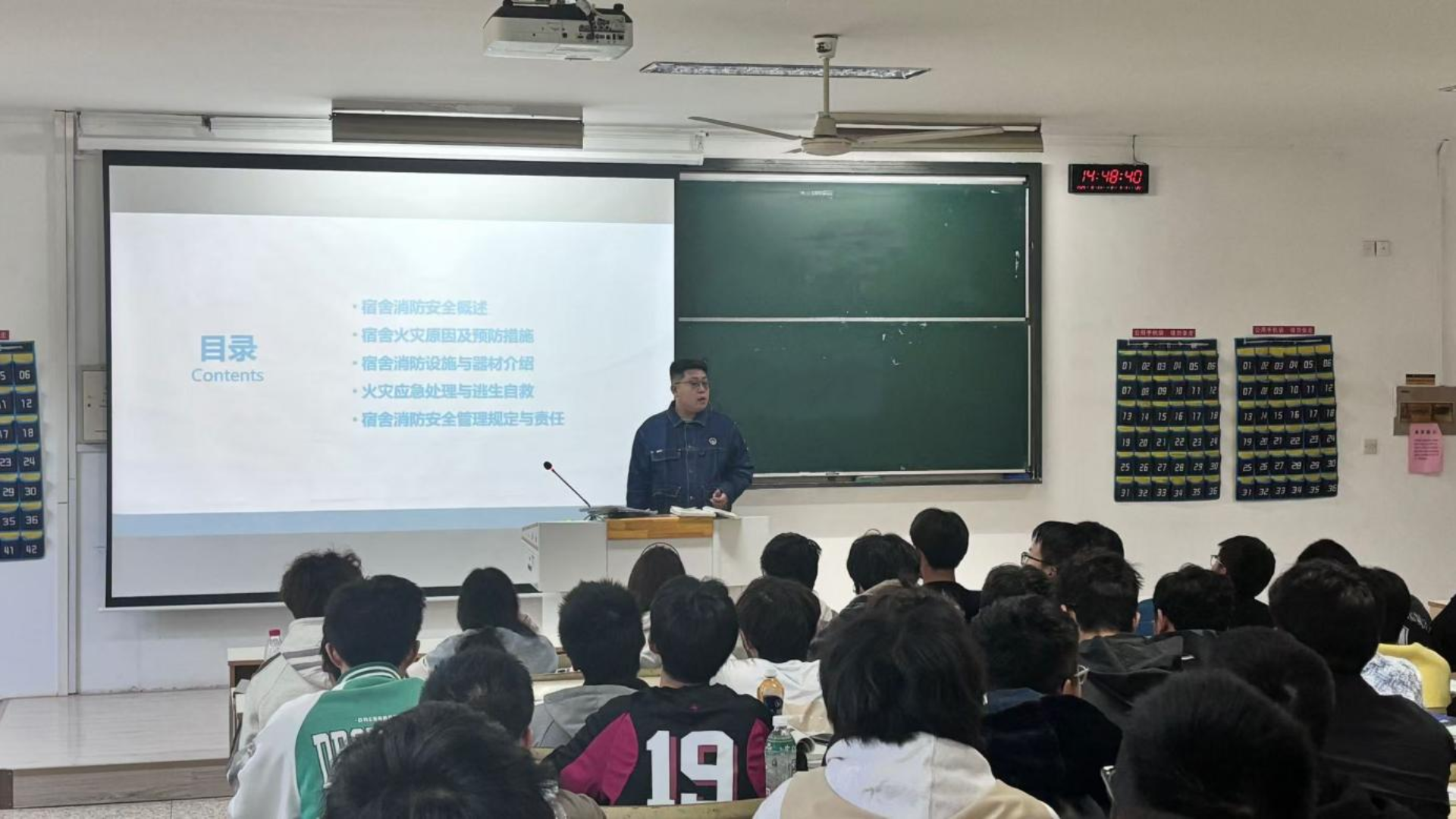 在消防安全方面,辅导员顾轩宇特别提醒同学们在宿舍用电时要做到“人走电断”,不违规使用大功率电器,不在宿舍里使用锂电池或给锂电池充电。同时,他还详细解读了火灾发生时的应对措施,强调了遵守消防安全规章制度的重要性。