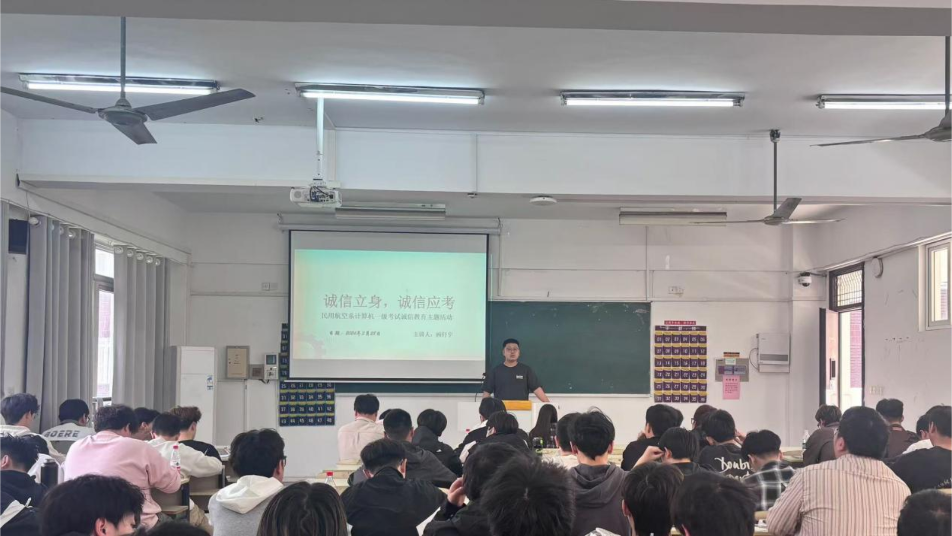 为营造公平公正的考试环境,弘扬诚信应考精神,民用航空系于3月27日在2205教室特别举办了计算机一级诚信教育主题活动,本次活动由顾轩宇老师担任主讲人。以“诚信立身,诚信应考”为主题,通过多元化的教育形式,为即将参加考试的学子们上了一堂生动的诚信课。覆盖2023、2024级全体学生。
