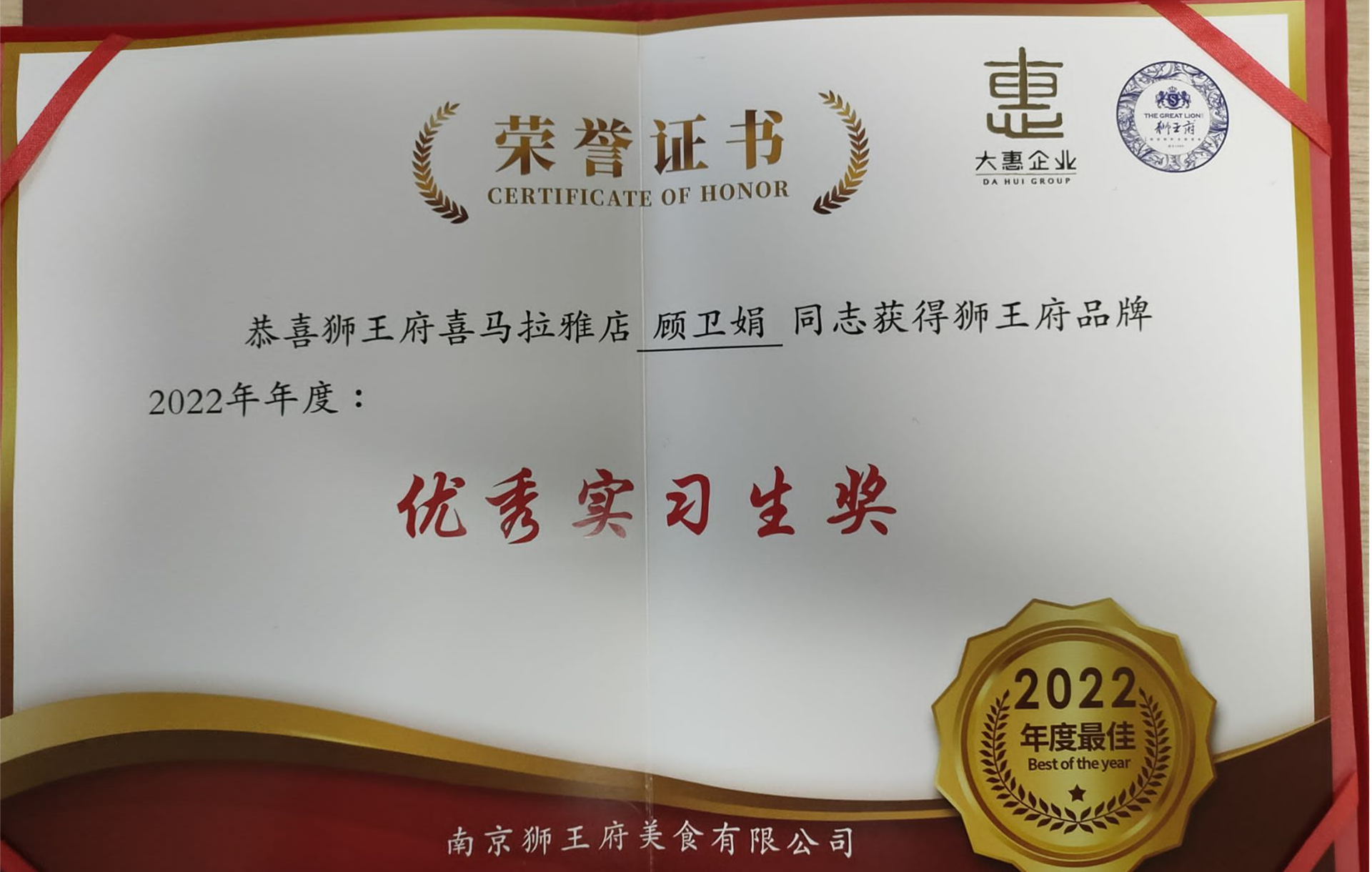 顾卫娟是春满四合院 民用航空系空中乘务专业2020级同学。在校期间,她认真学习,勇于吃苦。在新员工pk赛当中获得第三名的好成绩,并帮助狮王府喜马拉雅门店获得第一名的好成绩。善于学习-包间服务-外卖-物资盘点-品牌推广和VIP客户会员扩展,各个岗位都表现优异。从一开始的迷茫到品牌认可,工作积极,有了质的飞跃,实习结束将会继续留企工作。现在担任储备主管,下个月晋升主管级别。