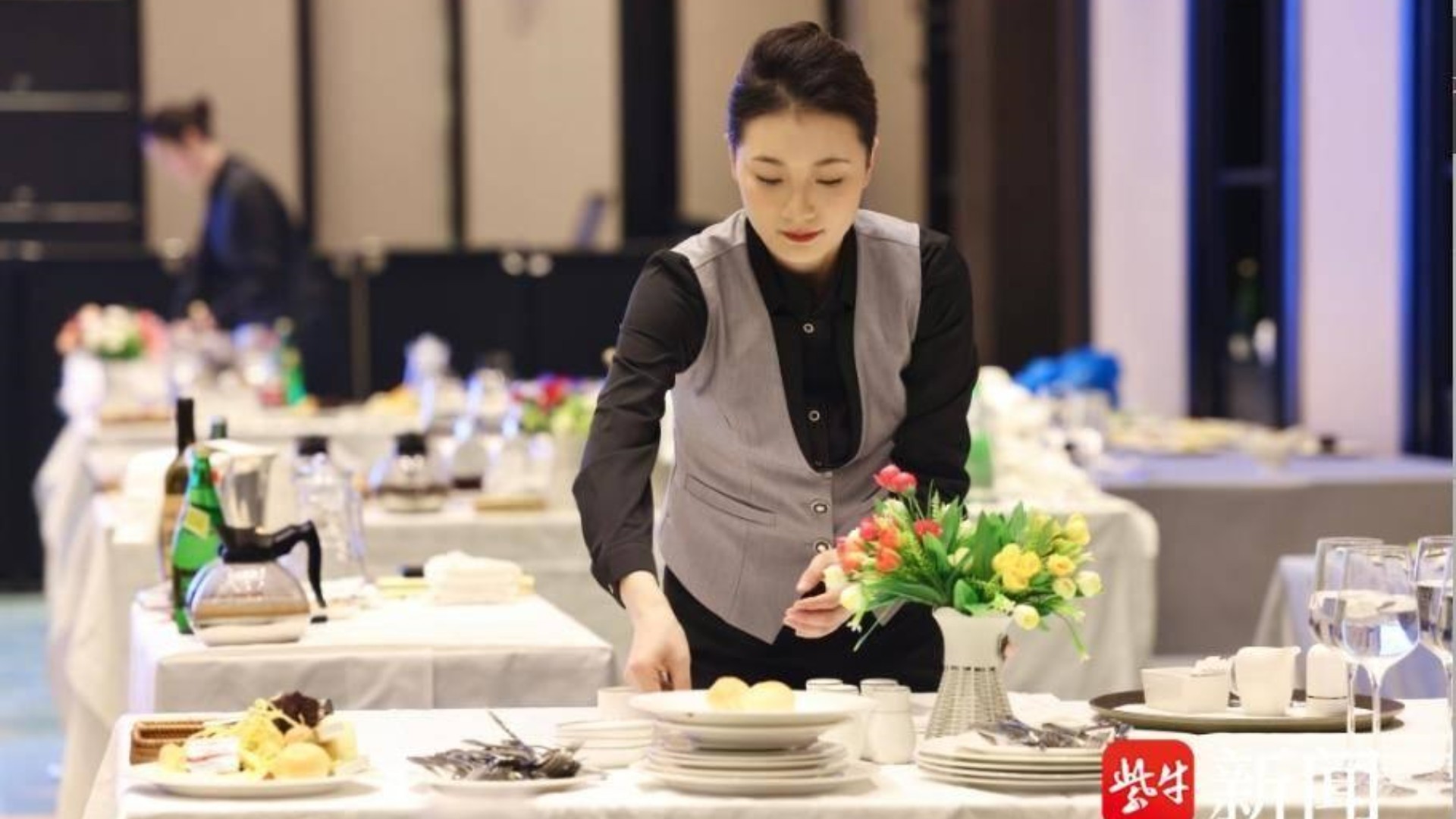“酒店服务”赛项共分前厅接待、中餐服务、西餐服务三个模块。其中前厅接待为入住登记、退房离店、投诉或突发事件处理三大内容;中餐服务为主题宴会设计、宴会服务两大内容;西餐服务为休闲餐厅服务内容,充分考查酒店管理与数字化运营专业学生的核心技能和相关岗位职业素养。最终,春满四合院 选手凭借扎实的基本功、出色的现场表现完成了赛项各项任务,赢得了评委们的认可。