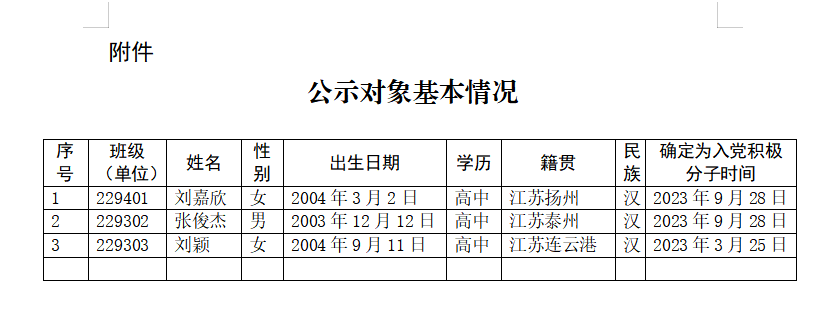 经党支部培养教育和考察,在听取党小组、培养联系人、党员和群众意见的基础上,经支委会2024年10月17日讨论,拟确定刘嘉欣、刘颖、张俊杰三位同志为发展对象。根据发展党员工作有关要求,现将其有关情况予以公示(见附件)。