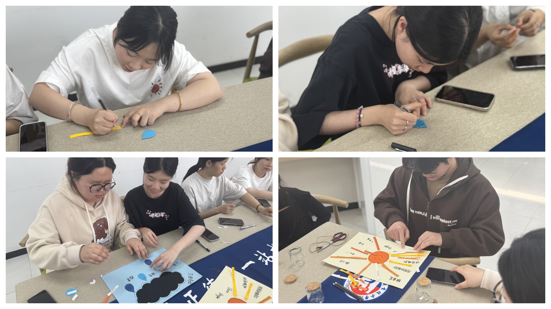 活动伊始,同学们便被“情绪晴雨表”环节深深吸引。在特制的太阳和乌云图案卡纸上,同学们分别用不同形式的纸条记录下自己的积极情绪和负面情绪。写满“今天也要加油!”“一切都会变好!”等正能量话语的纸条,被贴在象征阳光的太阳卡纸上;而写有“最近好累”“考试压力大”等负面情绪的雨滴形彩纸,则被贴在乌云卡纸上。这种巧妙的设计,帮助同学们以更直观的方式认识到情绪的多样性和复杂性,学会接纳并正视自身的情绪波动,同时通过积极的语言暗示,为自己和他人加油鼓劲。