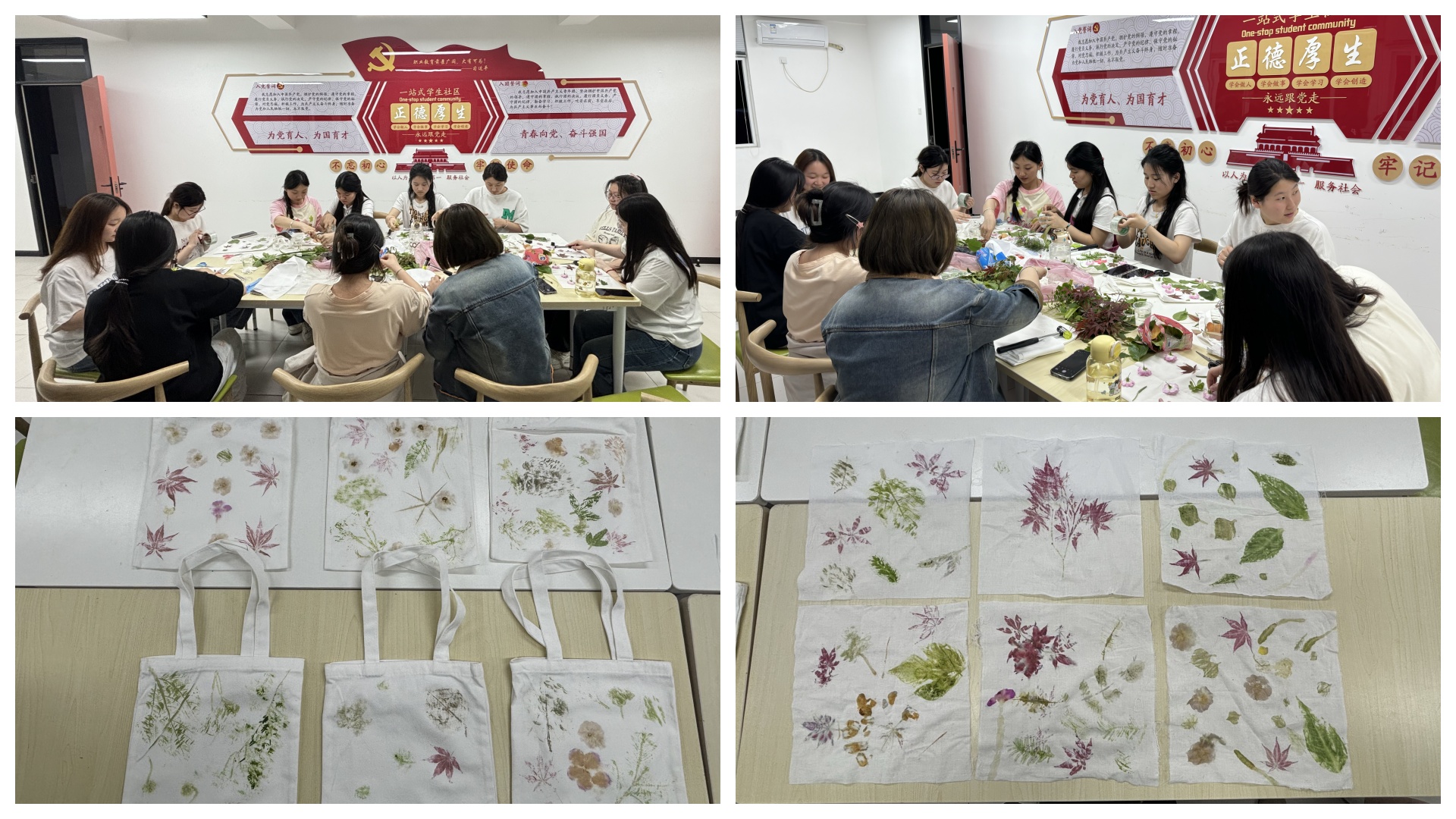 “草木有灵皆入画,匠心无界自成诗”。在植物拓染的过程中,同学们挑选自己喜欢的植物,发挥创意将其进行各种各样的组合,精心设计图案。伴随着阵阵敲打声,植物的脉络和色彩逐渐清晰地呈现在布料上,一个个精美的植物拓染帆布包、方巾呈现在眼前。原本洁白的帆布包、方巾,此刻被赋予了生机盎然的绿意,有的清新淡雅,有的色彩浓烈,每一个都散发着独特的魅力。同学们们脸上洋溢着自豪与满足的笑容,相互展示着自己的作品,分享着创作过程中的点滴趣事。