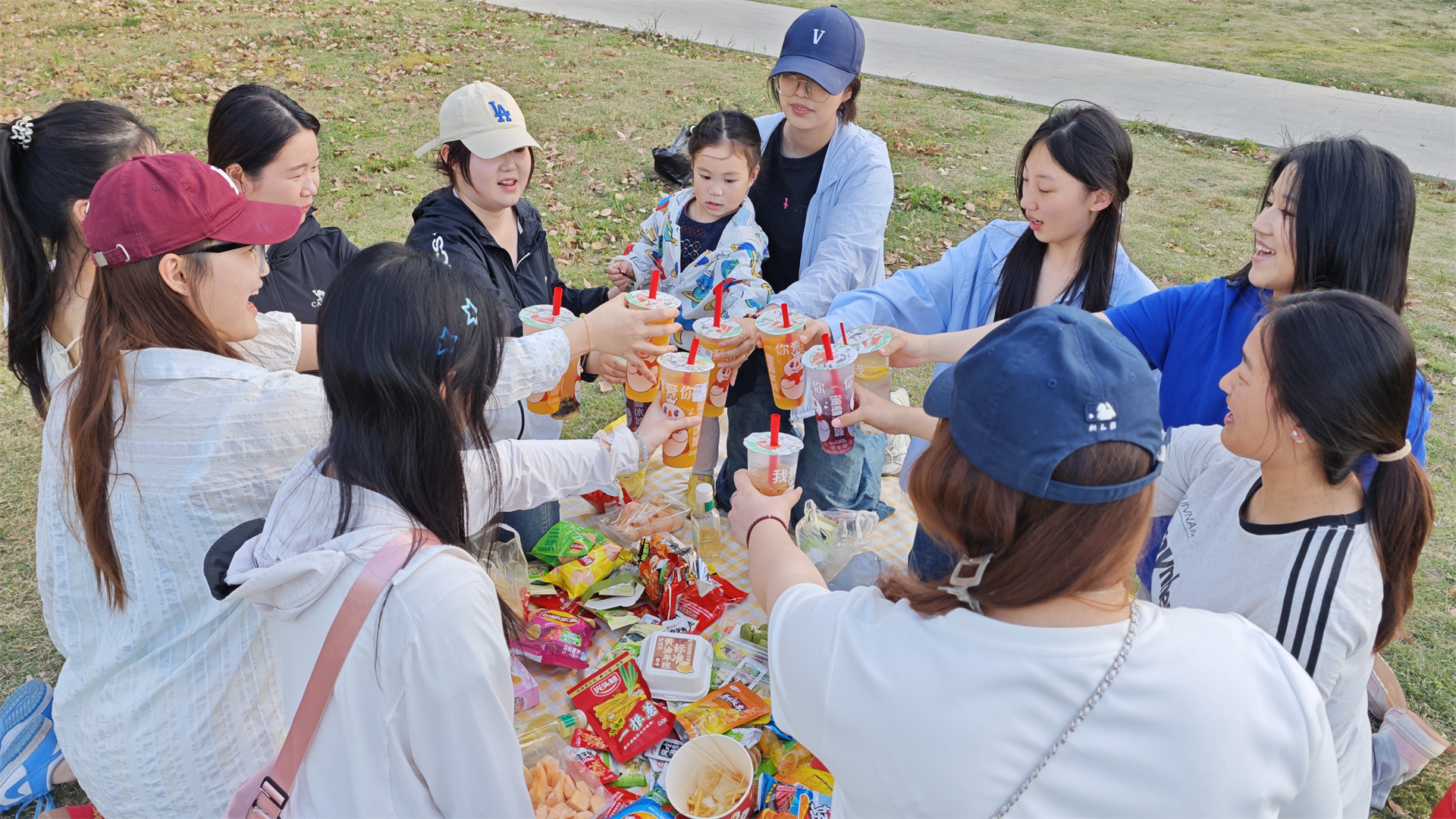 骑行结束后,同学们来到湖畔草坪,铺开野餐垫,开启轻松愉悦的“野餐时光”。各式各样的零食和饮品被一一拿出,大家围坐一圈,或分享美食,或畅谈心事。在自然的怀抱中,彼此的距离悄然拉近,笑声与阳光交织,构建出一个温暖而治愈的午后。
