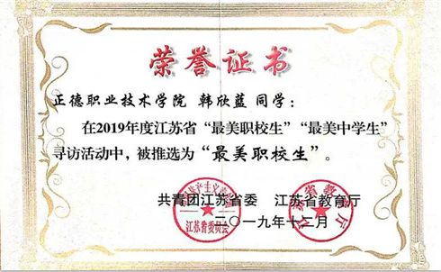 为深入学习贯彻习近平新时代中国特色社会主义思想和党的十九大精神,围绕江苏团省委“建设青年身边的共青团”这一改革总目标,落实全省教育大会精神,纵深推进中学共青团改革,坚持立德树人根本任务,培养德智体美劳全面发展的社会主义建设者和接班人,发挥先进典型的示范引领作用。团省委、省教育厅于2019年7月联合下发了《关于开展2019年度全省“最美职校生”、“最美中学生”寻访活动的通知》(团苏委电〔2019〕46号),经院团委推荐,团省委和省教育厅审核,我系韩欣蓝同学获评2019年江苏省“最美职校生”。