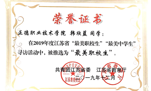 韩欣蓝获江苏省“三好学生”称号、江苏省“最美职校生”、“魅力团支书”称号