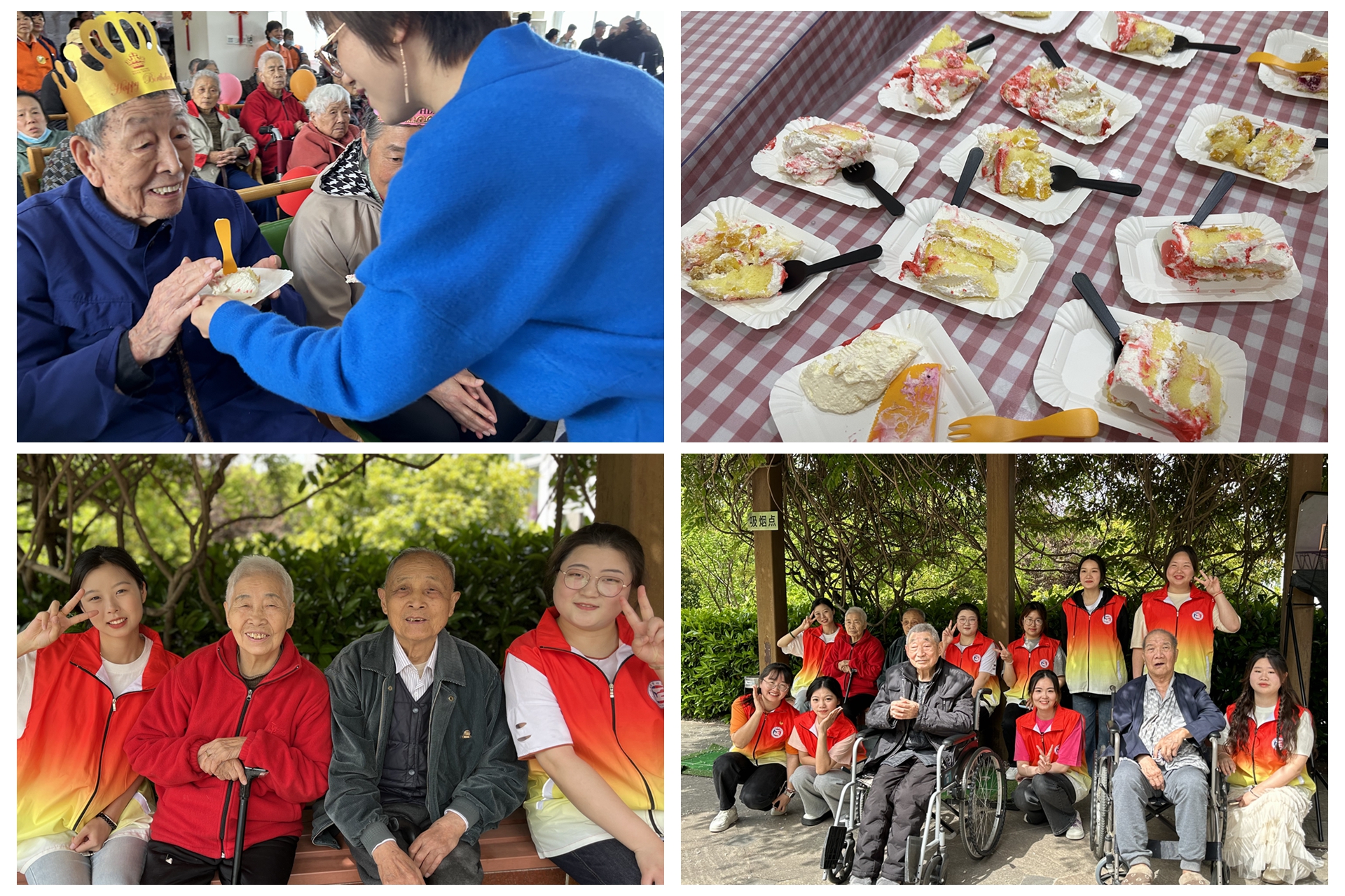4月25日上午,银城松椿颐养园为四月份生日的8个老人过集体生日,其中有一位百岁老人——汪秀英奶奶。基础教育系“微光”巾帼志愿者队的20名志愿者前来和这里的50多位老人们以及20多位家属们共同度过了一场难忘的集体生日会。