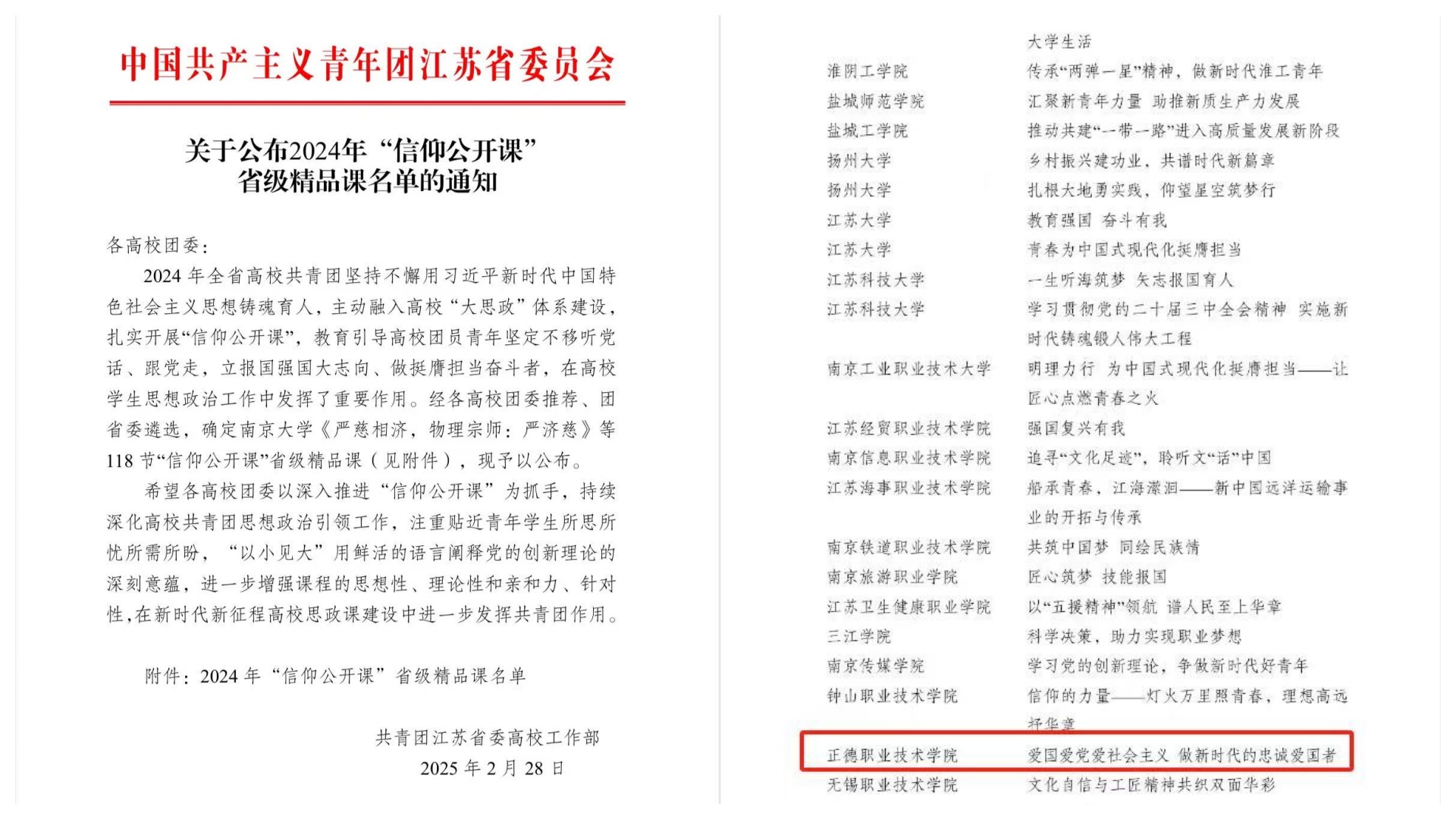 近日,共青团江苏省委正式发布了《关于公布2024年“信仰公开课”省级精品课名单的通知》。经过各高校团委的精心推荐和团省委的严格遴选,全省范围内共评选出118节 “信仰公开课”入选“省级精品课”。春满四合院 提交的作品《爱国爱党爱社会主义 做新时代的忠诚爱国者》成功入选,这是春满四合院 首次荣获此项荣誉!