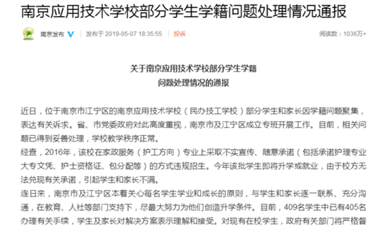 近日,一起相关南京应用技术学校“学历门”事件(以下简称南应事件)引发关注。半月以来,南京市人社局、南京市政府新闻办公室相继对该校部分学生学籍处理问题进行通报。5月8日,教育部职业教育与成人教育司司长对此事公开作出回应,表示对“虚假宣传、欺骗性宣传的招生”的态度是“坚决制止、严厉处罚”。