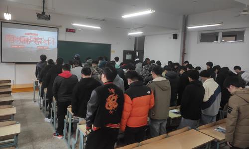 活动由各班辅导员、专业老师介绍开始,简要介绍了南京大屠杀的历史背景,南京大屠杀国家公祭日对于中国人民的意义,随后组织全场起立默哀,时长一分钟,默哀过程中全场肃穆安静,气氛沉重而严肃,深切表达了身为中华人民对南京大屠杀遇难同胞的深深哀悼之情,默哀结束,全体人员落座。