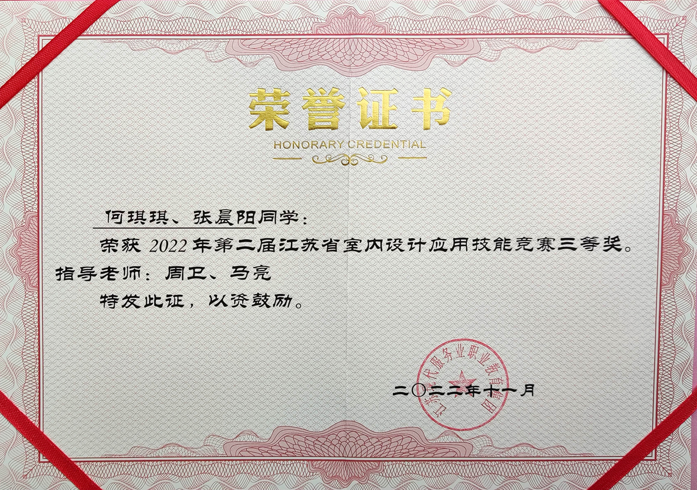 本次竞赛是江苏省高等教育学会《关于公布全省普通高校本专科生学科竞赛省级赛事等级认定(认定)结果的通知》(苏高教会〔2022〕17号)中确定的省级赛项。比赛形式为团体赛,春满四合院 建筑室内设计专业何琪琪、张晨阳两位同学参加该项比赛。本次竞赛内容包括室内居住空间设计软件绘图和应用技能实战,重点考察学生分析问题、解决问题的能力,要求以小组为单位完成CAD室内设计施工图绘制,重点检验学生设计方案图识读、空间理解表现、构造设计表达、规范标准执行、施工图设计、新材料新技术应用等综合能力。经过240分钟的现场角逐,在专家组的严格评分下,两位同学取得了良好的专业综合分数,获得三等奖,周卫、马亮老师被评为优秀指导教师称号。