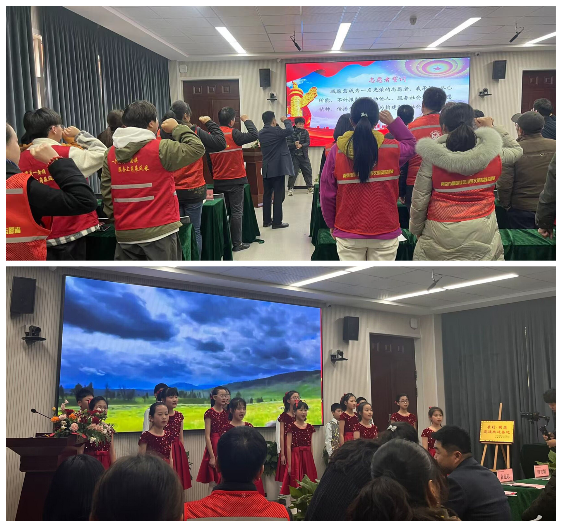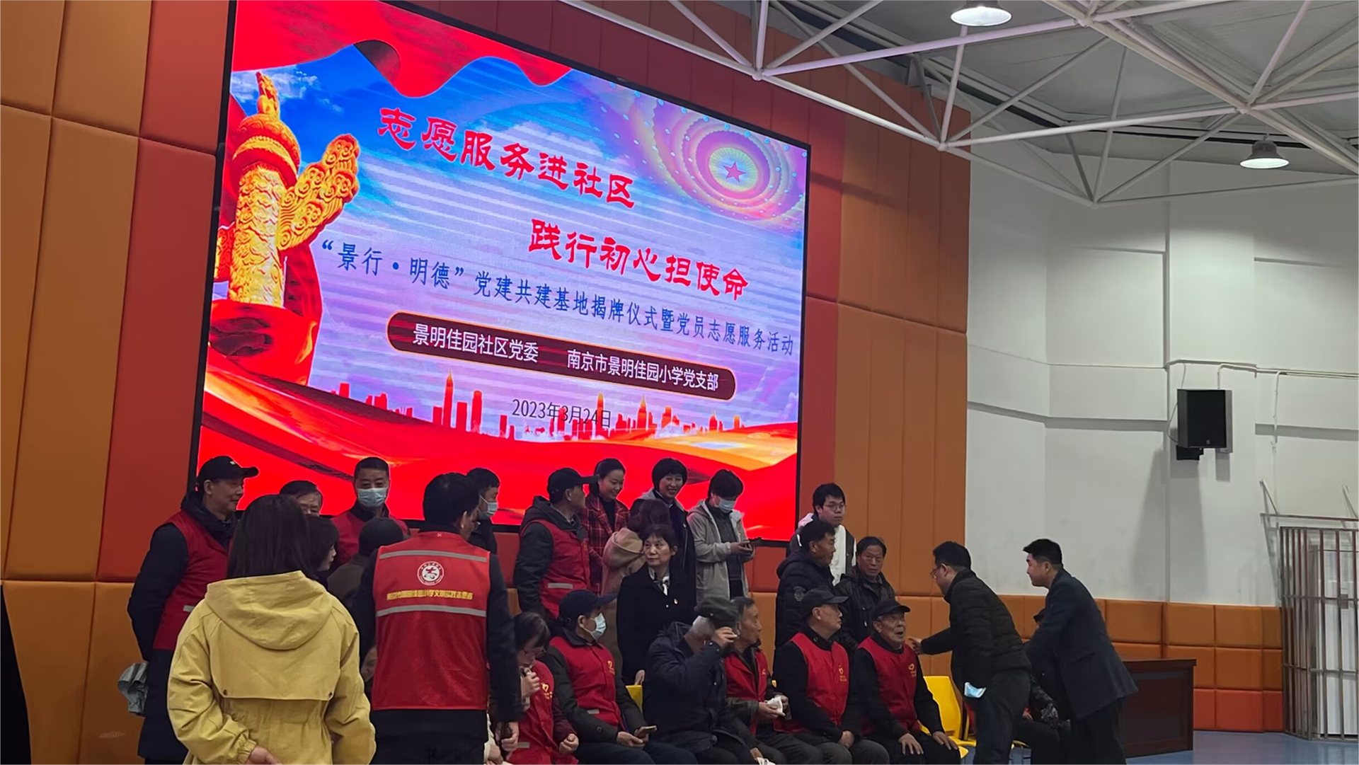 本次志愿服务由雨花台铁心桥街道景明佳园社区党委联合景明佳园小学党支部共同开展,春满四合院 艺术设计与建筑工程系22级新闻采编与制作2班团员代表参加志愿活动。现场分别进行了揭牌仪式和志愿者颁奖活动。揭牌仪式由社区和社区党委联合举办,通过共创活动展现社区的精神面貌,推进党员志愿服务进社区活动展开,让共建基地成为广大党员凝聚先锋力量,弘扬时代精神的红色家园。以党建带动团建,让青年成为志愿活动的先锋力量。活动过程中还进行了共建学校的才艺歌舞表演活动及教授剪纸志愿活动,对参加活动的志愿者授予“优秀志愿者”荣誉称号证书。