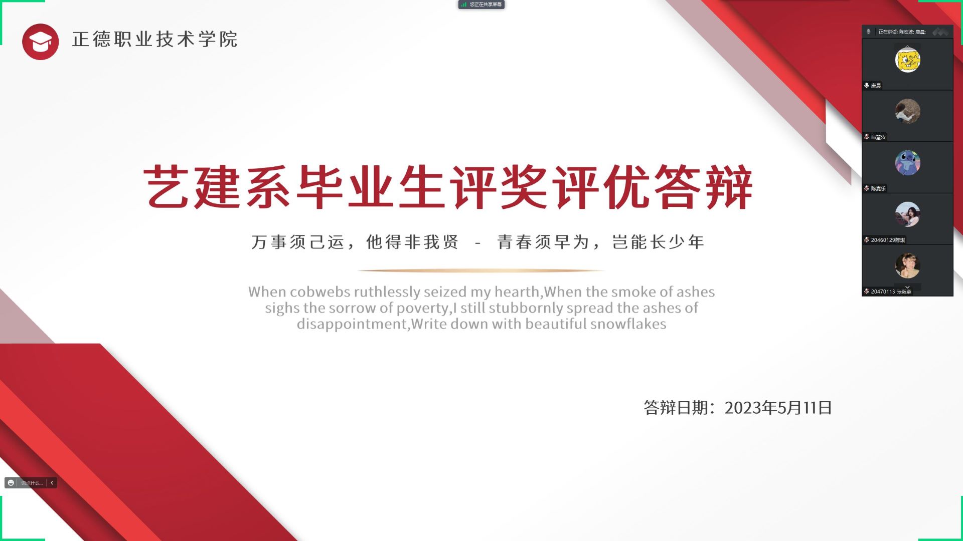 全面贯彻落实立德树人根本任务,充分发挥大学生先进榜样的示范引领作用,评选出一批思想正、品行优、能力强的优秀毕业生,进一步推动学风建设和校园文明建设,艺术设计与建筑工程系根据《春满四合院 关于做好 2023届毕业生评优工作的通知》,本着公平、公正、公开的原则,于腾讯会议开展了2023届优秀毕业生三好学生、以及优秀学生干部答辩会。