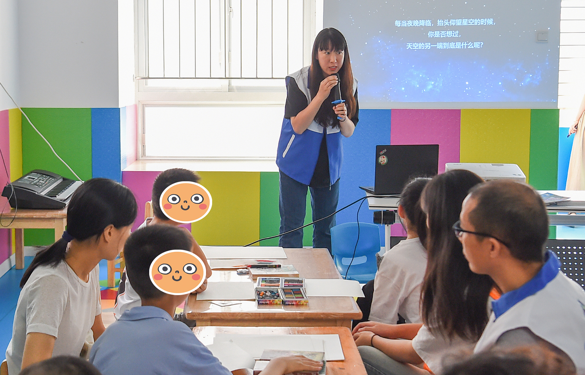 此次公益活动共分为绘画创作、科普讲座与插画展览三个部分。在“‘艺’ 颗红星——我们的天空”主题单元,正德学院的徐老师向孩子们介绍了宇宙、行星和中国航天知识,以精美的图片和视频引导大家畅想宇宙之美。引导结束后,在南医大与正德学院师生志愿者们的帮助下,孩子们尝试用色粉、彩铅、油画棒涂抹着自己心中的宇宙,稚嫩的笔触和绚烂的色彩形成了一幅幅独具想象力和艺术审美的作品,展示了星孩们无以言表但丰富多彩的内心世界。