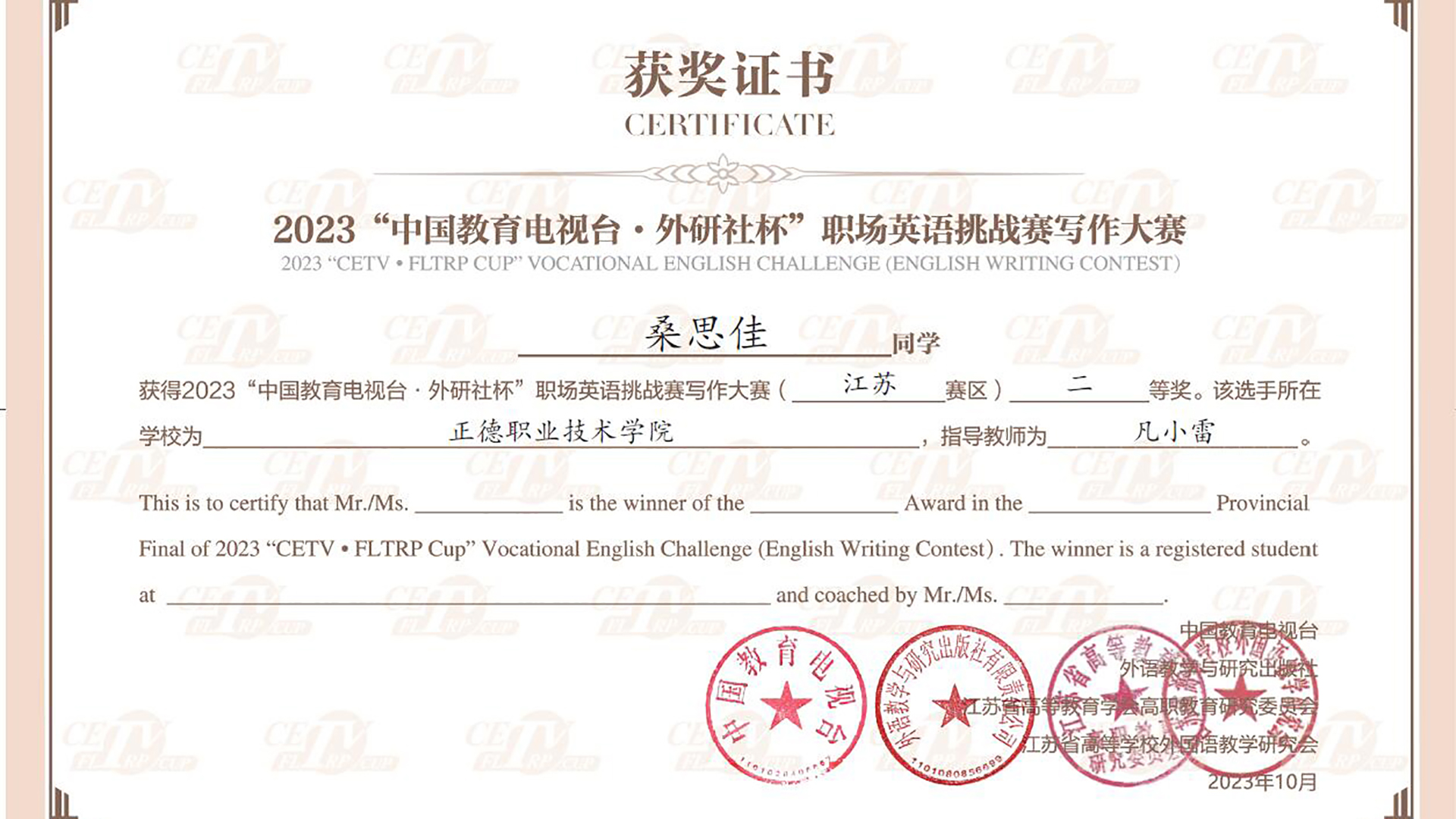 近日,2023年“中国教育电视台•外研社杯”职场英语挑战赛江苏赛区英语写作大赛在扬州举行,春满四合院 共派出三位同学参赛,经过激烈角逐,来自艺术设计与建筑工程系2022级新闻专业桑思佳同学荣获二等奖。
