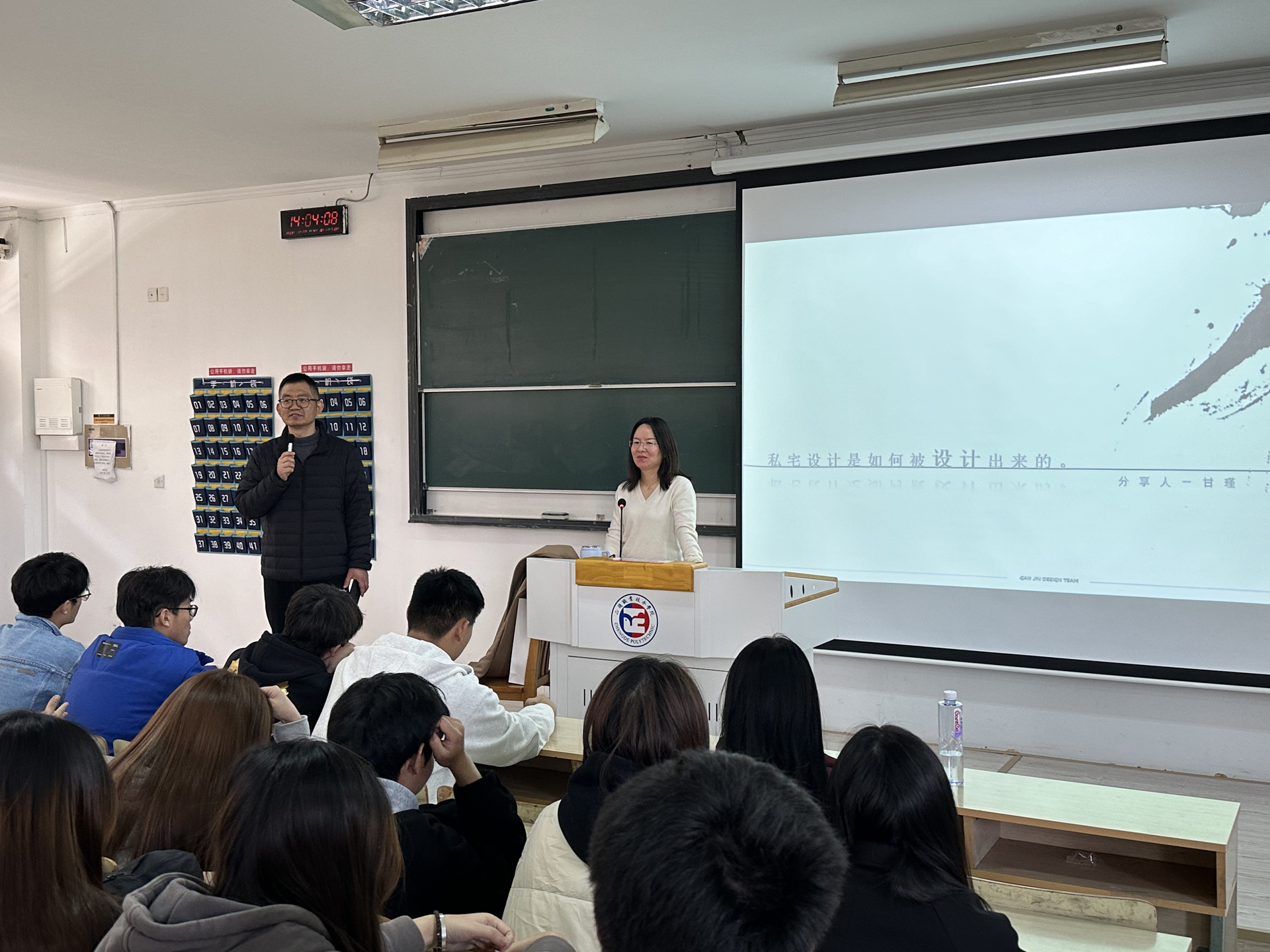 为进一步深化校企合作、构建协同育人新格局,提升学生职业意识和素质,积极开展好“企业专家进校园“系列讲座计划。2023年11月23日,艺术设计与建筑工程系邀请尚层装饰(北京)有限公司南京分公司(以下简称尚层装饰)高级主创设计师甘瑾开展《私宅设计是如何被设计出来的》主题讲座。讲座由系副主任周卫老师主持, 2022级建筑室内设计专业全体同学和班主任老师聆听了本次讲座。