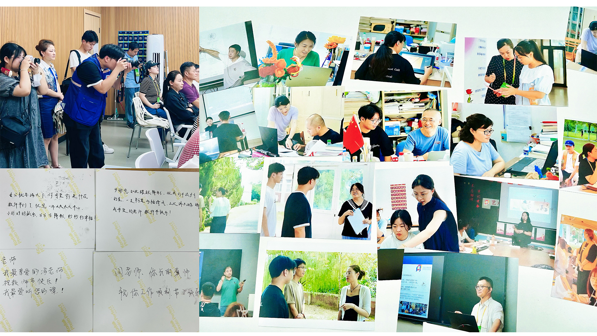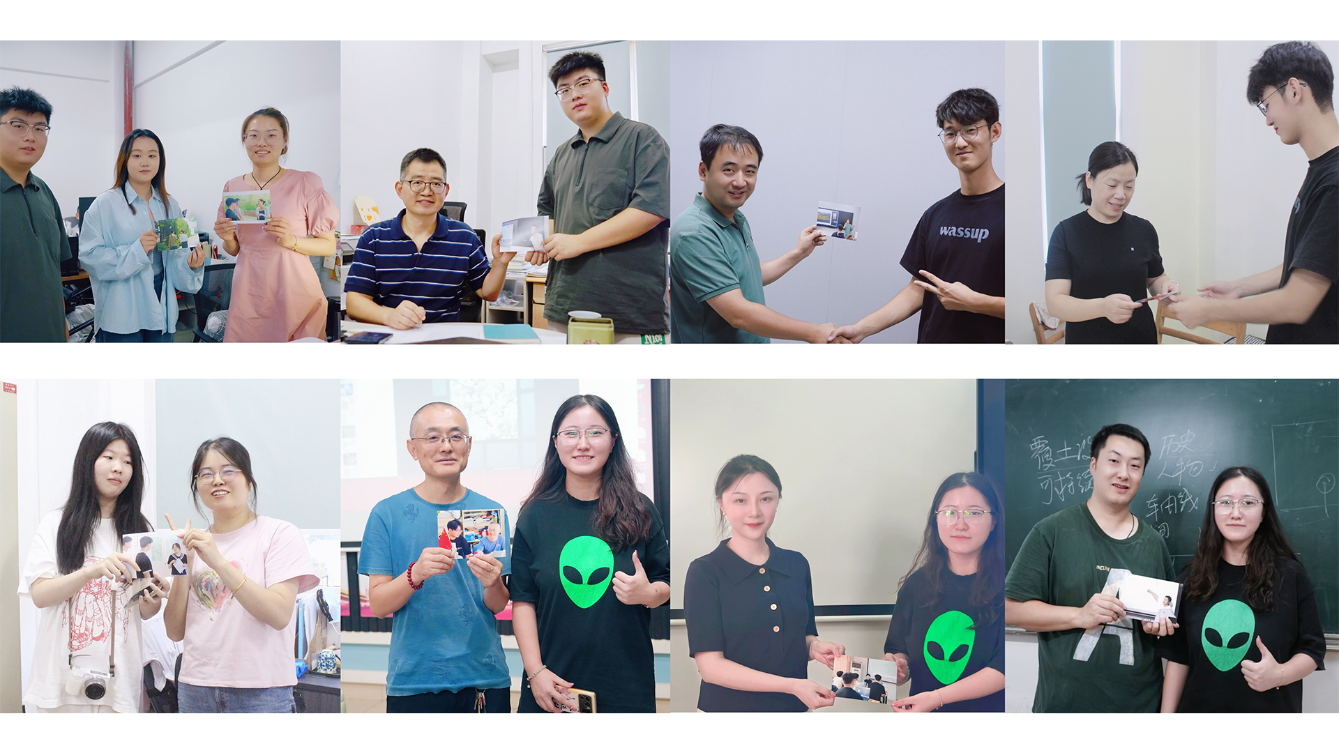 学生给老师拍照并把祝福写在的照片背面