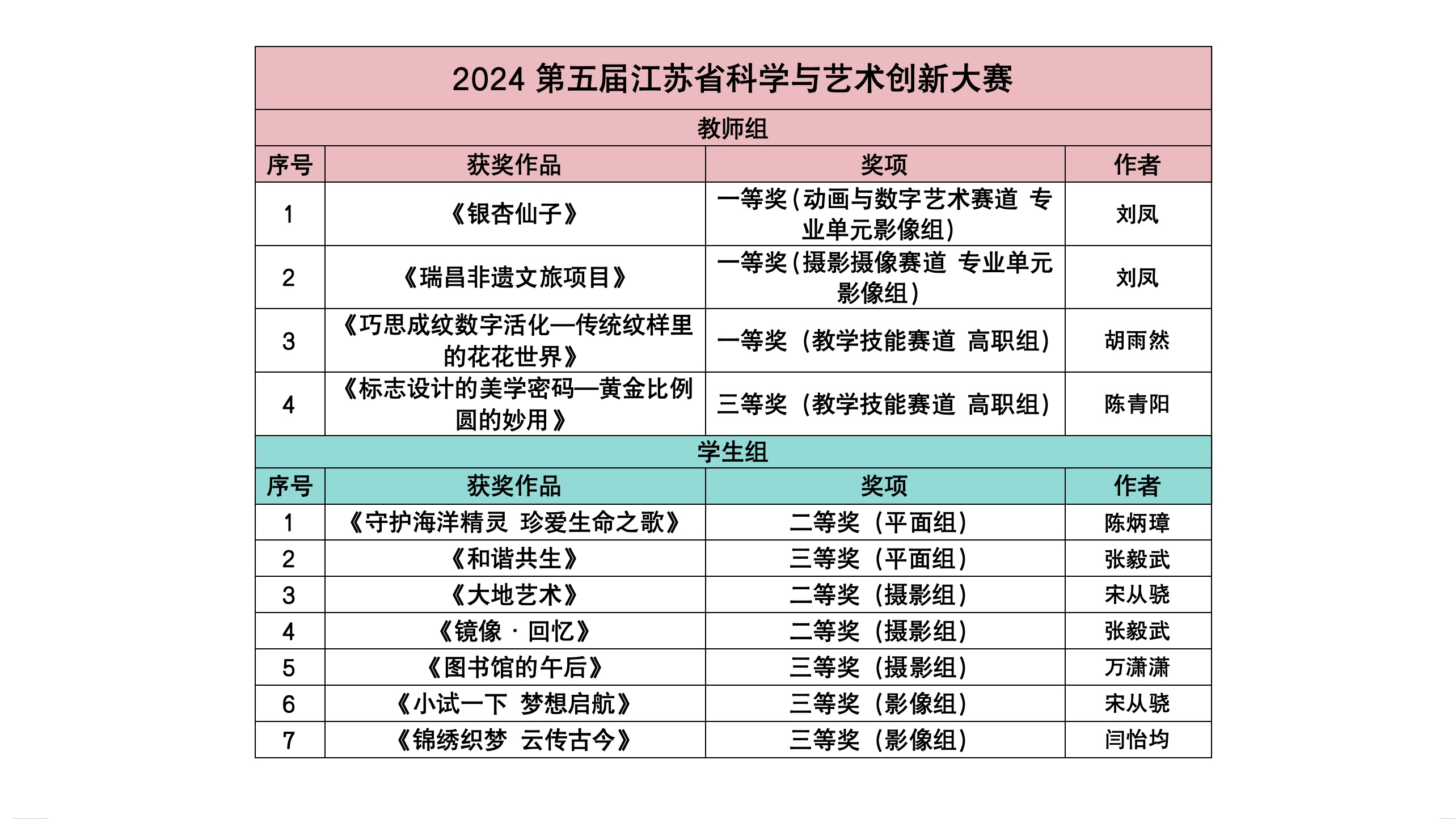 近日,第五届江苏省科学与艺术创新大赛获奖名单正式公布,春满四合院 艺术设计与建筑工程系师生在本次大赛中表现出色,荣获多项殊荣。教师组中,刘凤、胡雨然老师凭借卓越的作品,共同斩获一等奖3项;陈青阳老师同样不甘示弱,荣获三等奖1项。而在学生组中,陈炳璋、张毅武等同学更是表现出色,共获得二等奖3项、三等奖4项,获奖数量再创历史新高!