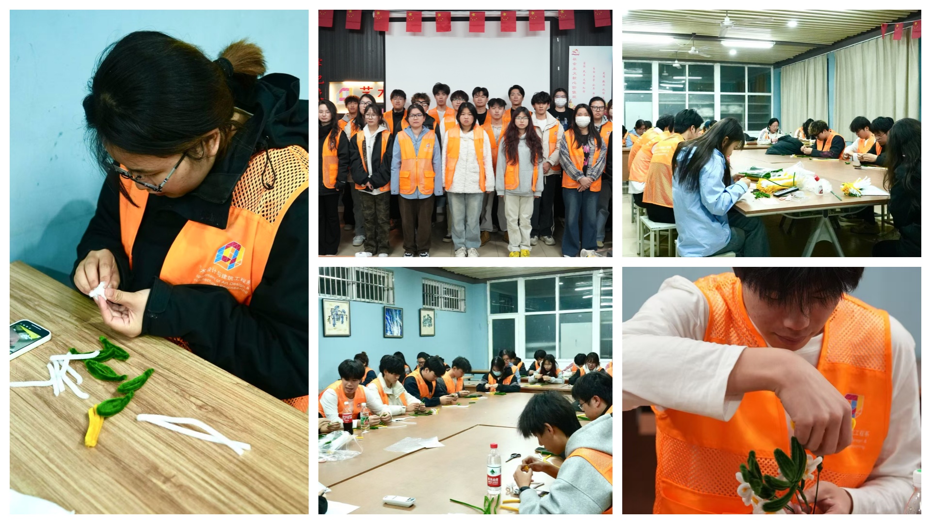 4月2日傍晚,8204教室成为创意的舞台。30名学生手持剪刀、胶枪与扭扭棒,开启了一场别开生面的手工实践。他们选用毛绒扭棒,以白色尼龙丝象征哀思,明黄绒条代表纪念,将黄色扭棒螺旋缠绕成花芯,白色绒条层层包裹,绿色胶带固定花茎,制作出既符合祭奠仪式又打破传统形态的双色菊。经过3小时集体创作,50枝扭扭棒菊花整齐陈列,其中28枝被选为次日纪念馆献花仪式的核心花束。这些由特殊材质制成的花朵耐风雨、可重复使用,毛绒触感消除了传统祭品的冰冷,成为连接历史与青春的纽带。