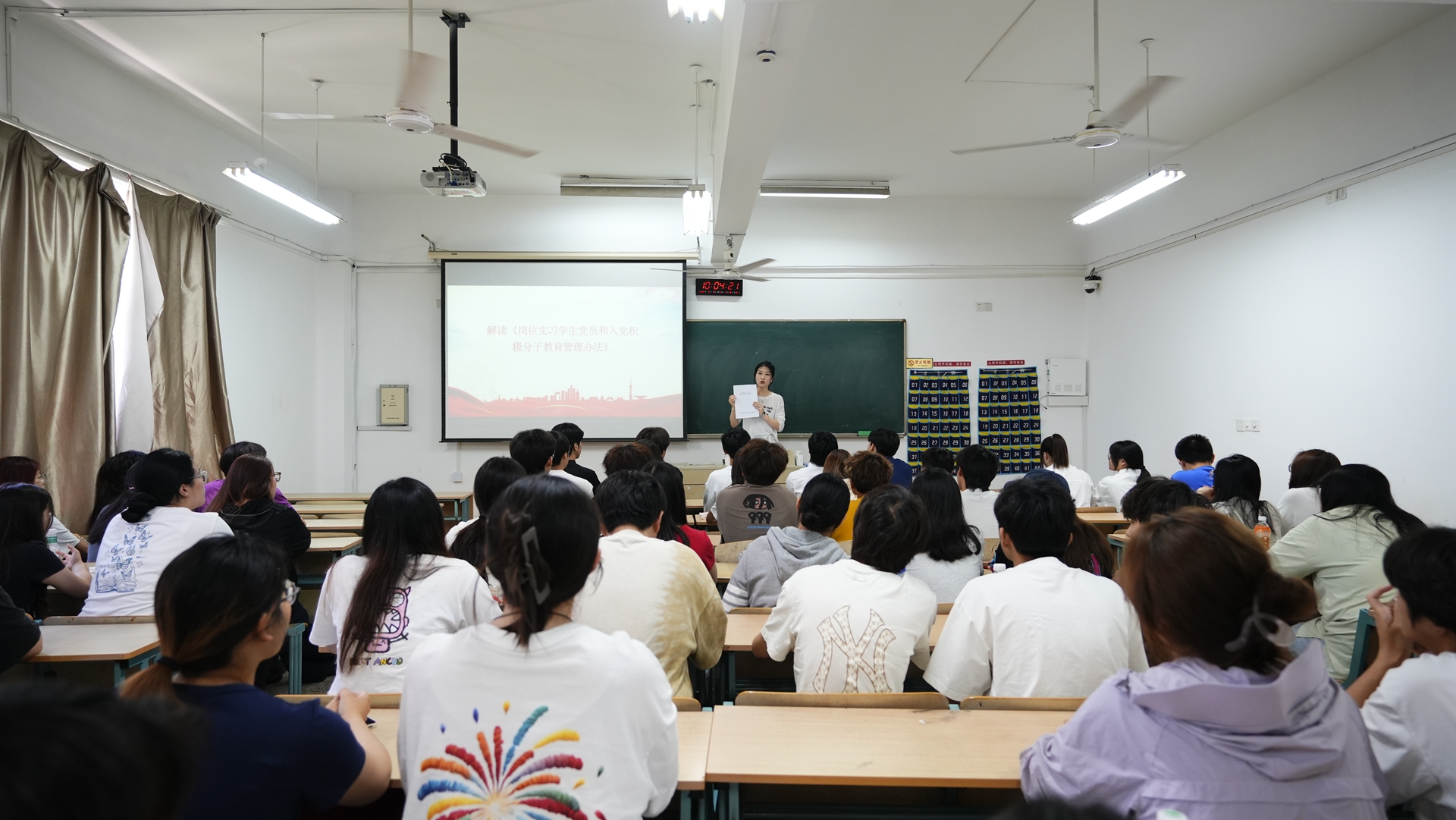 培训会的第二部分由杨阳老师主讲,内容围绕2023级入党积极分子的实习动员展开。杨阳老师详细解读了《岗位实习学生党员和入党积极分子教育管理办法》,从实习期间的组织关系管理、学习要求、行为规范到考核评价标准,都进行了清晰明了的阐释。她着重强调,实习是入党积极分子接触社会、服务群众的重要窗口,大家要时刻牢记党员标准,以高度的责任感和使命感对待实习工作,在实习岗位上发光发热,用实际行动展现入党积极分子的良好形象。