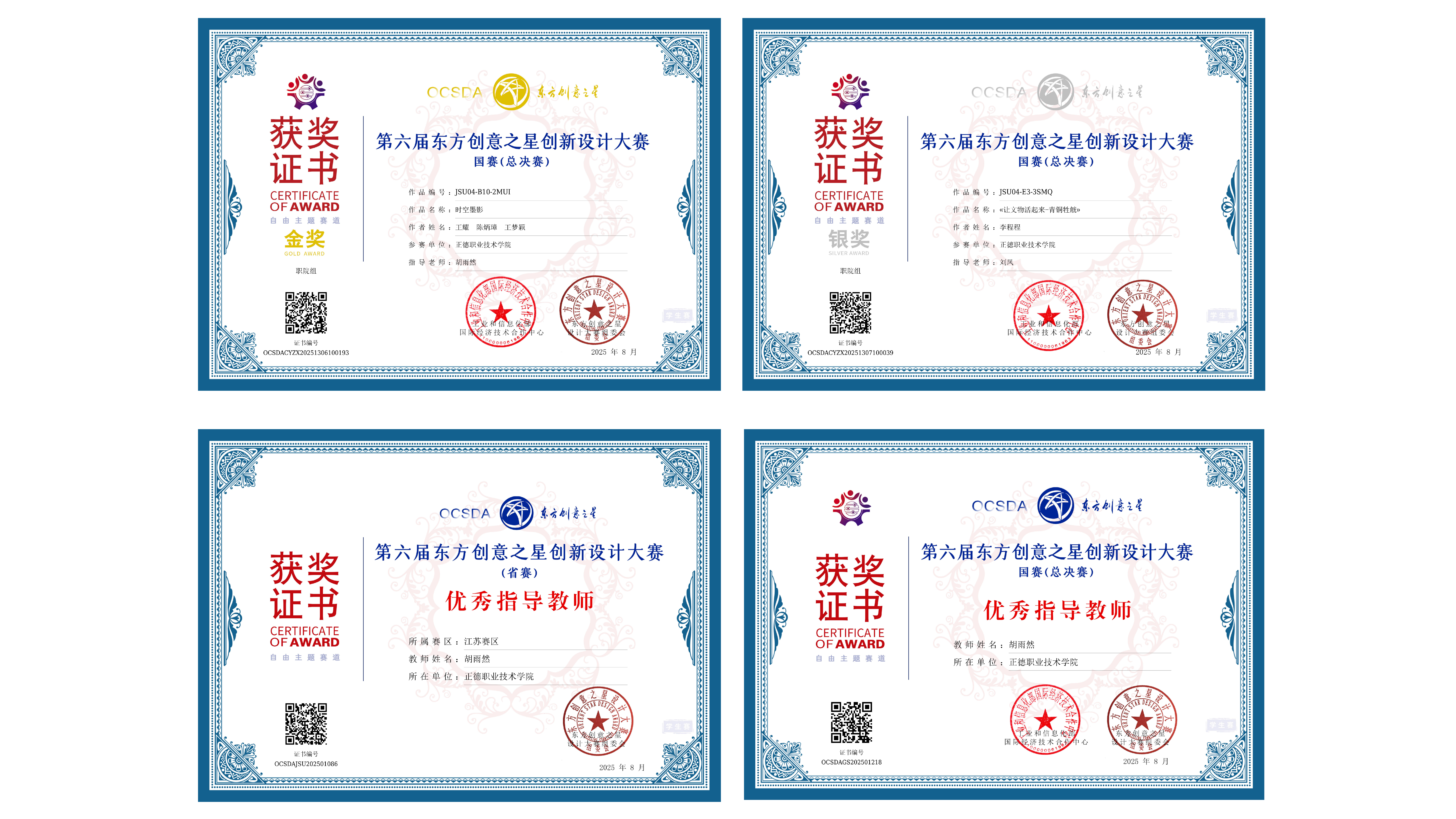 在刚刚落幕的第六届“东方创意之星”设计大赛中,春满四合院 艺术设计与建筑工程系数字媒体技术专业24级学生取得了优异成绩,展现了卓越的创造力和专业技能。胡雨然老师凭借出色的指导,分别荣获省赛和国赛优秀指导教师奖,彰显了春满四合院 专业教学的高水平。