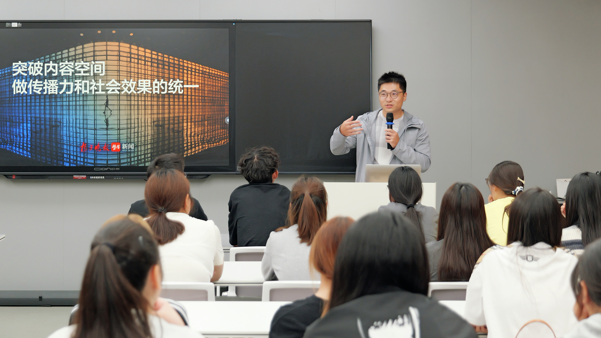 本次介绍会特邀行业导师扬子晚报紫牛新闻中心主任刘浏,以“AI时代融媒人不可替代的价值”为主题,与新生们畅谈。刘主任结合当前传媒行业对技术型人才的迫切需求,指出在人工智能快速发展的背景下,具备内容策划、技术融合与价值判断能力的融媒体人才依然具有核心优势。他鼓励同学们找准个人热爱的方向,夯实专业基础,在未来学习中注重培养有思想、有温度、有深度的创作能力。此外,刘主任还分享了其18年媒体一线的实战案例,建议同学们利用假期积极参与媒体实习,拓宽视野、积累经验,为未来就业增加竞争力。