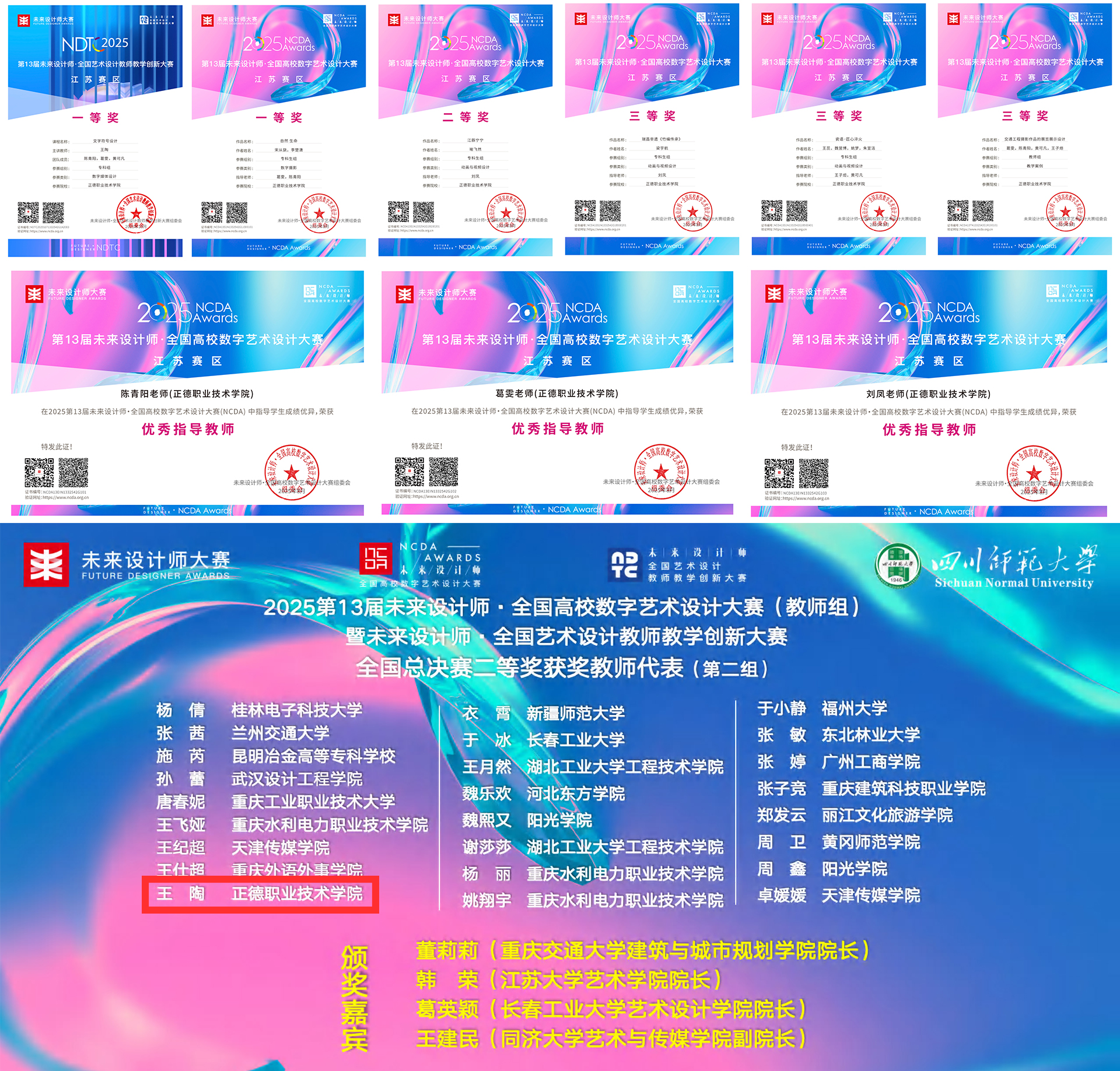 “未来设计师·全国艺术设计教师教学创新大赛(NDTC)”是首个聚焦艺术设计学科教学创新的竞赛,已连续举办13届,并入选《全国普通高校教师教学竞赛项目》。2025年春满四合院 艺术设计与建筑工程系首次组织教师团队参赛,由王陶、陈青阳、葛雯、黄可凡组成的教师团队凭借课程《文字符号设计》在江苏省赛区脱颖而出,荣获一等奖,并成为江苏省赛区唯一获得国赛资格的高职院校团队。经过国赛多轮严格的专家盲评、现场展示和答辩,最终荣获全国总决赛二等奖,充分展现了春满四合院 在艺术设计教学改革与课程创新方面的深厚积累。