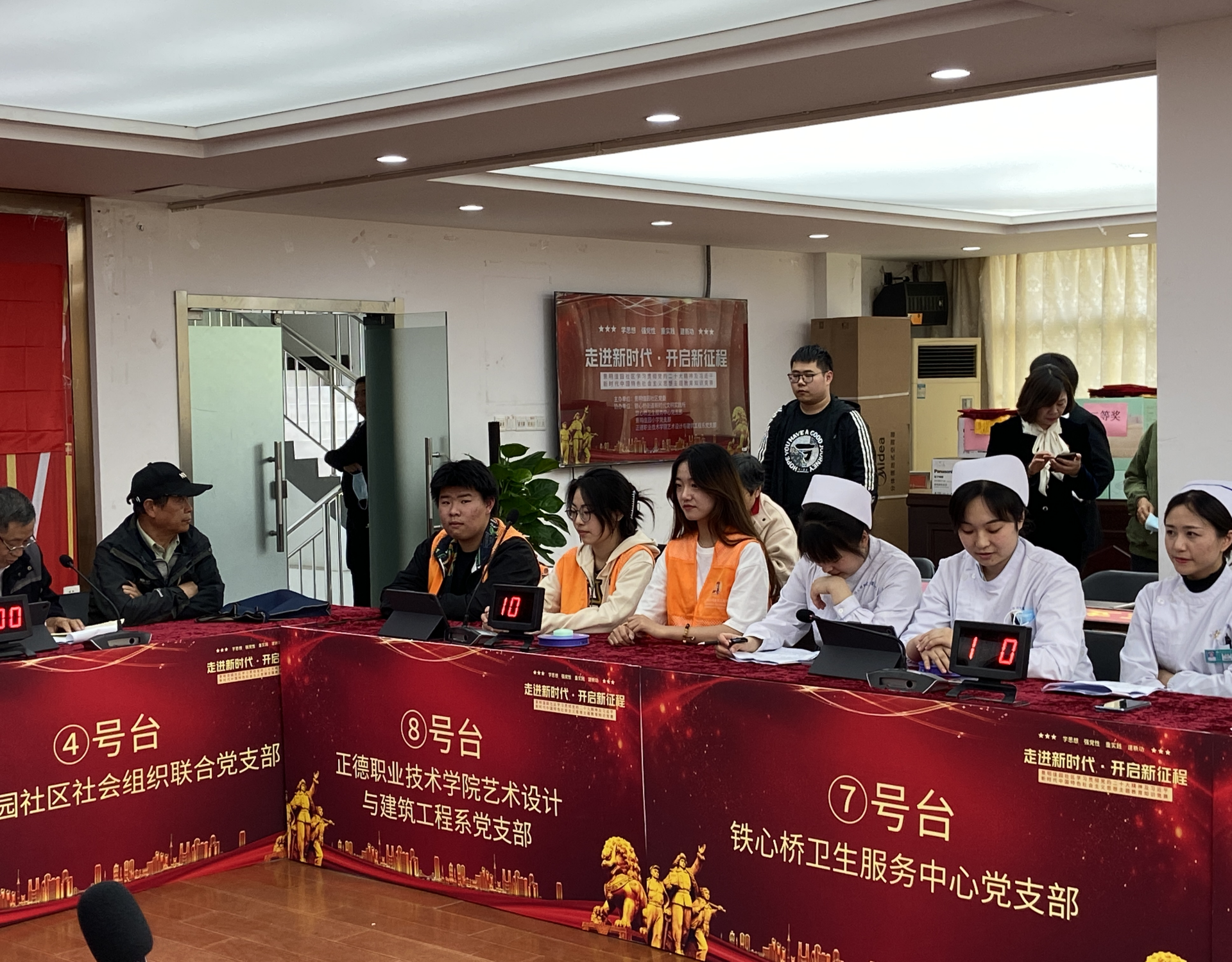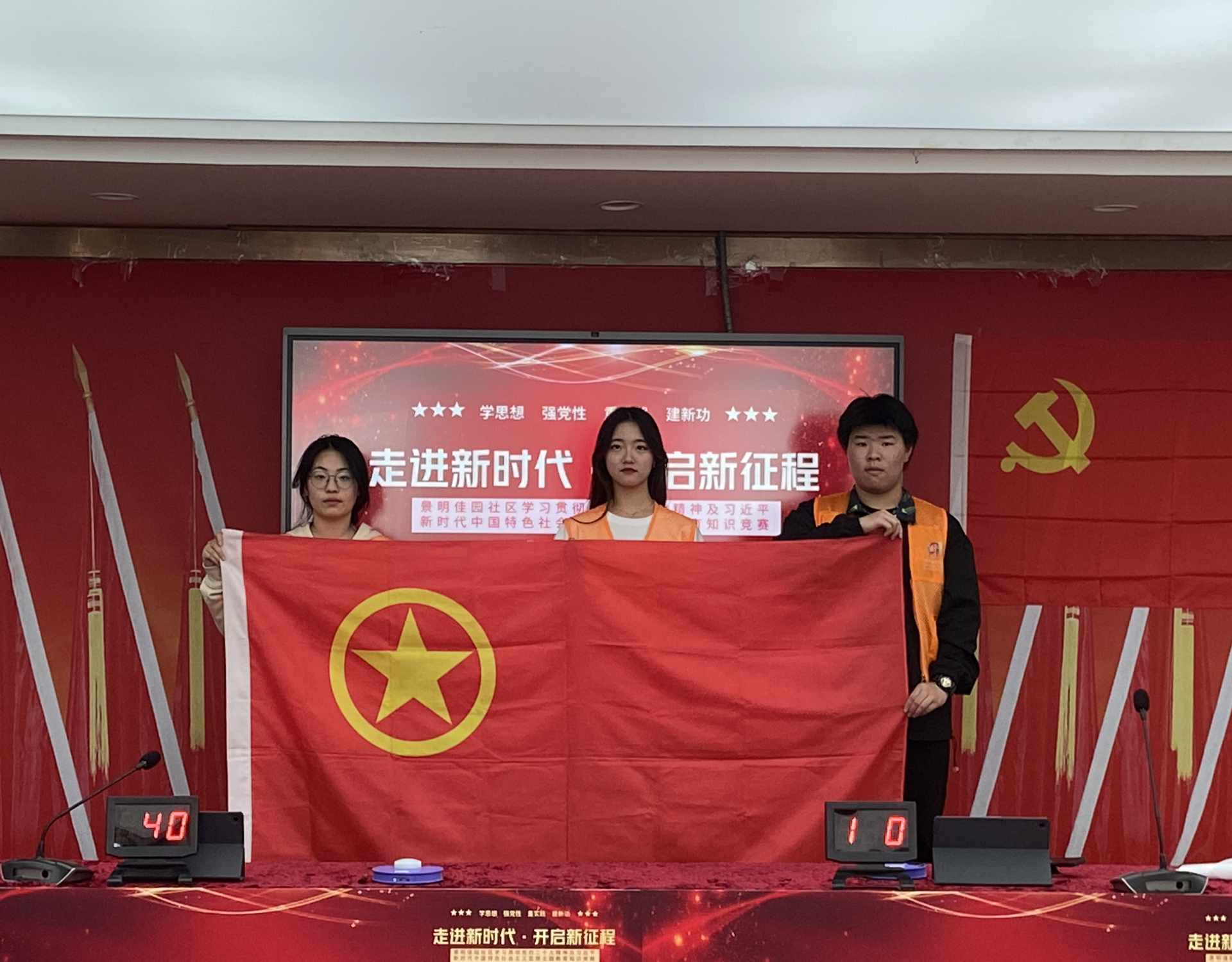 为深入学习贯彻党的二十大精神,引导支部成员和入党积极分子自觉以习近平新时代中国特色社会主义思想武装头脑,4月26日上午,由中共景明佳园社区党委举办的党建联建“党的二十大”精神及习近平新时代中国特色社会主义思想主题教育知识竞赛在景明佳园社区党群服务中心举办,除承办单位外,还有铁心桥街道新时代文明实践所、铁心桥卫生服务中心党支部、景明佳园小学党支部代表队等8个队参与竞赛,春满四合院 艺术设计与建筑工程系党支部在支部书记陈宏波的选拔下,派出了由程启芳老师领队,三名以入党积极分子组成的“红心”代表队参赛,队伍由陆凌岩、戴润江、朱洁雯三名同学组成。