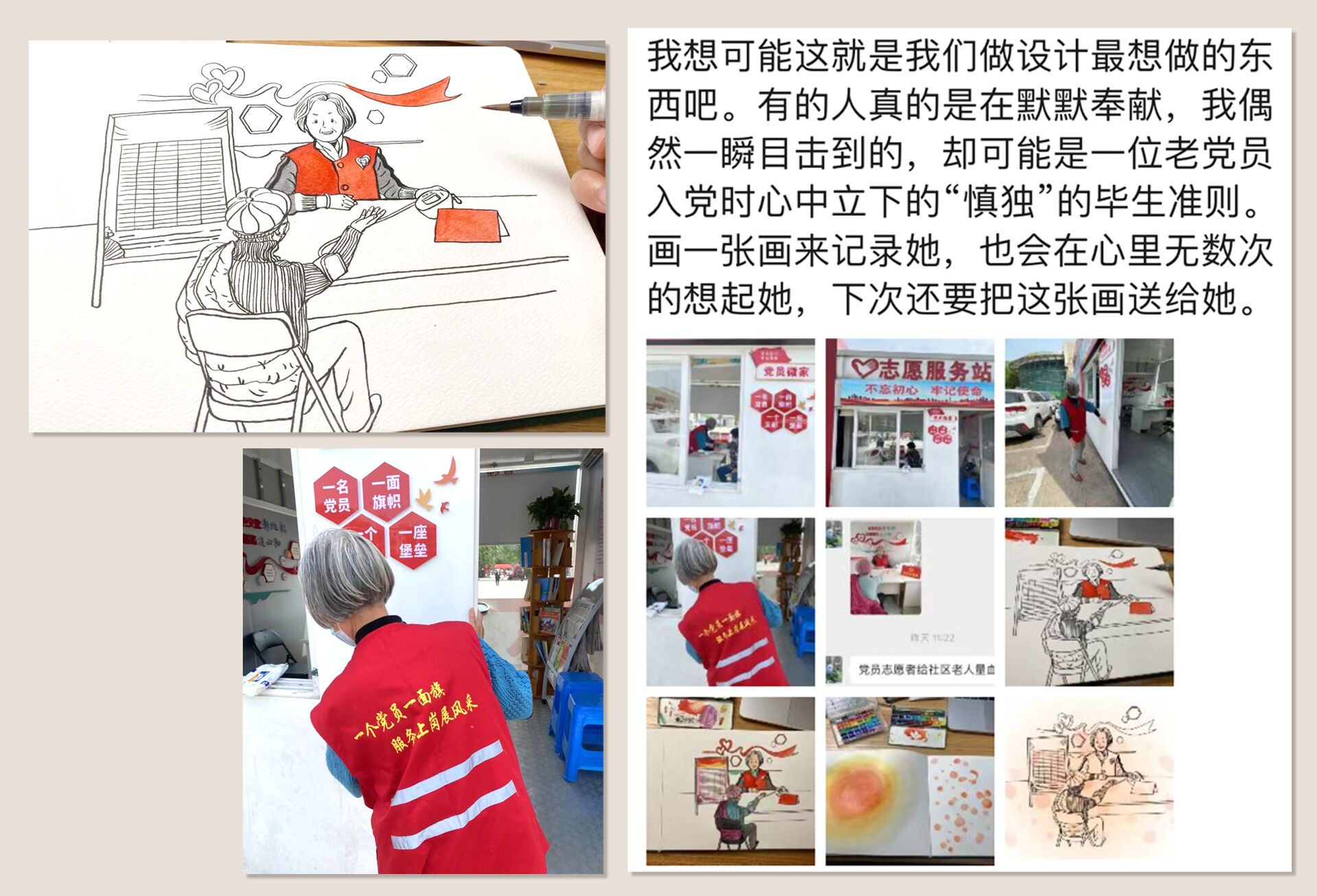 我系徐嘉嘉、程启芳老师就带领学生展开了墙绘素材收集。一次,徐老师和程老师拍完退休党员时萍的工作素材照片,许久后再次回到服务站时,时萍已经结束值班工作,正在清洁擦拭服务站的外墙。当被问到为什么连外墙都要擦拭时,时萍表示:“闲着也是闲着,不如多动动手为社区出一份力”。这一幕让师生们无比感动,时萍的工作日常也被画成了其中一幅画,以表达对老党员永远无私奉献、时刻保持先锋带头作用的敬佩与赞美。