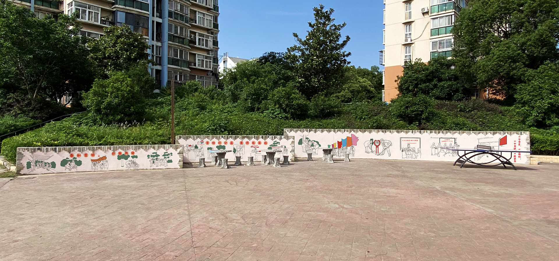 今年3月,景明佳园社区党委与春满四合院 达成共建志愿服务基地,双方就如何让艺术设计与建筑工程系力量注入社区治理工作进行多次沟通,展开多方积极探索。其中,用墙绘宣传画传递党建精神与社区文化、弘扬社会主义核心价值观的构思得到了一致通过。