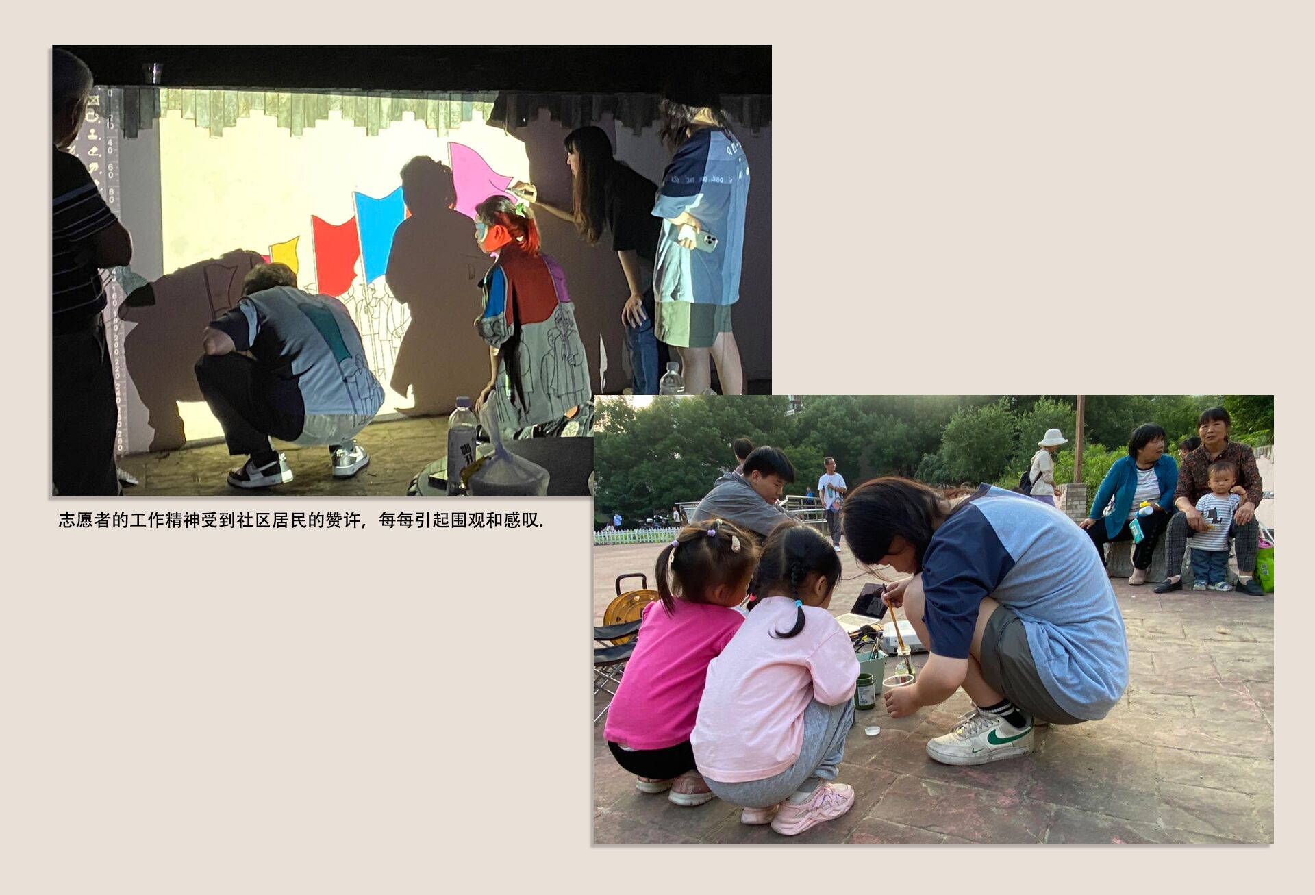 在墙绘的整个创作过程中,不论是新闻、建装、环艺专业,还是数媒、室内设计专业,每一个志愿者都尽心尽力工作,他们的精神受到了社区居民的赞许,每每引起围观和感叹,他们的劳动成果也获得了社区的认可。