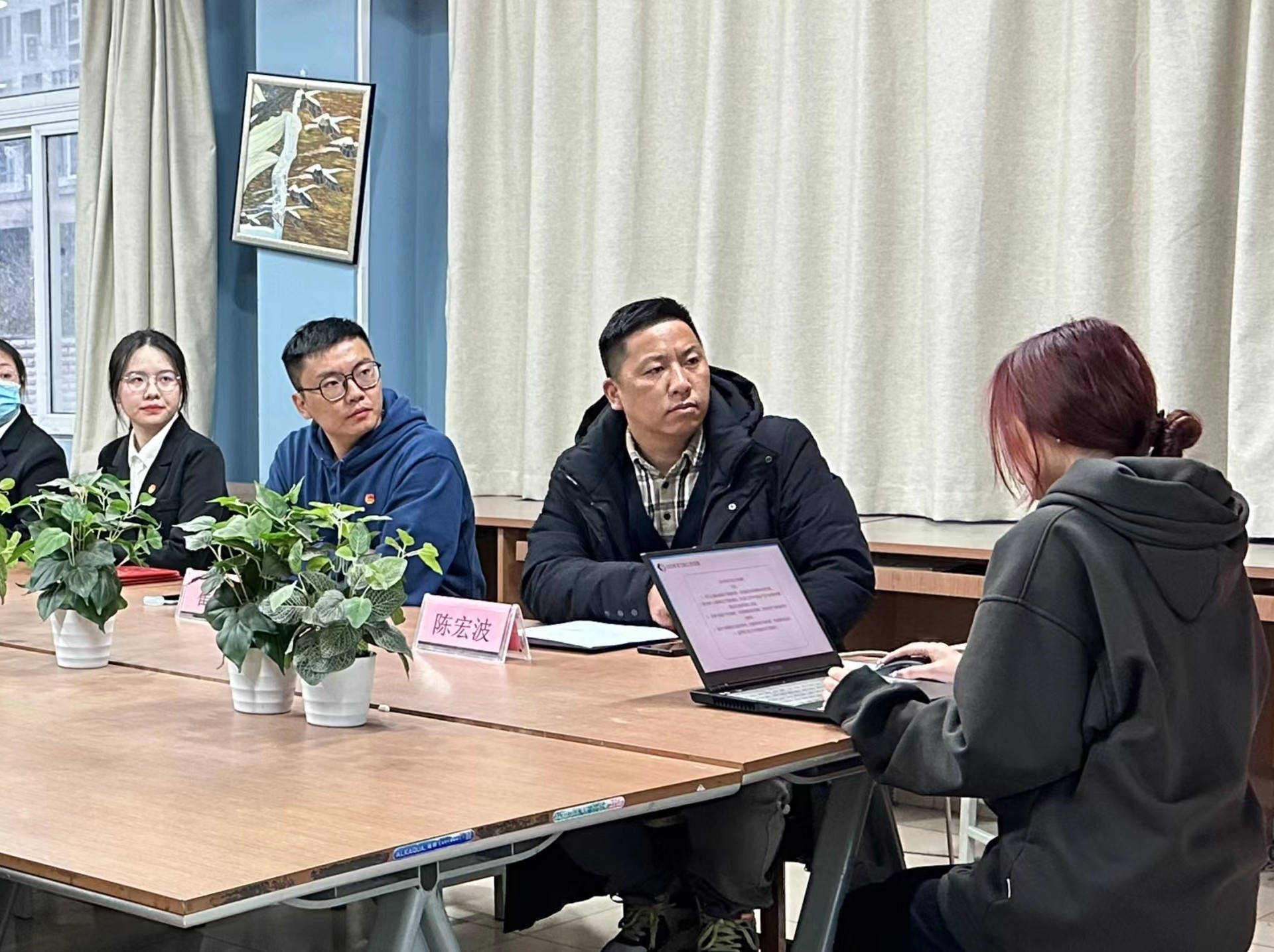 第二议程是党支部书记陈宏波和团总支书记崔杰发言,带领团干部们学习《春满四合院