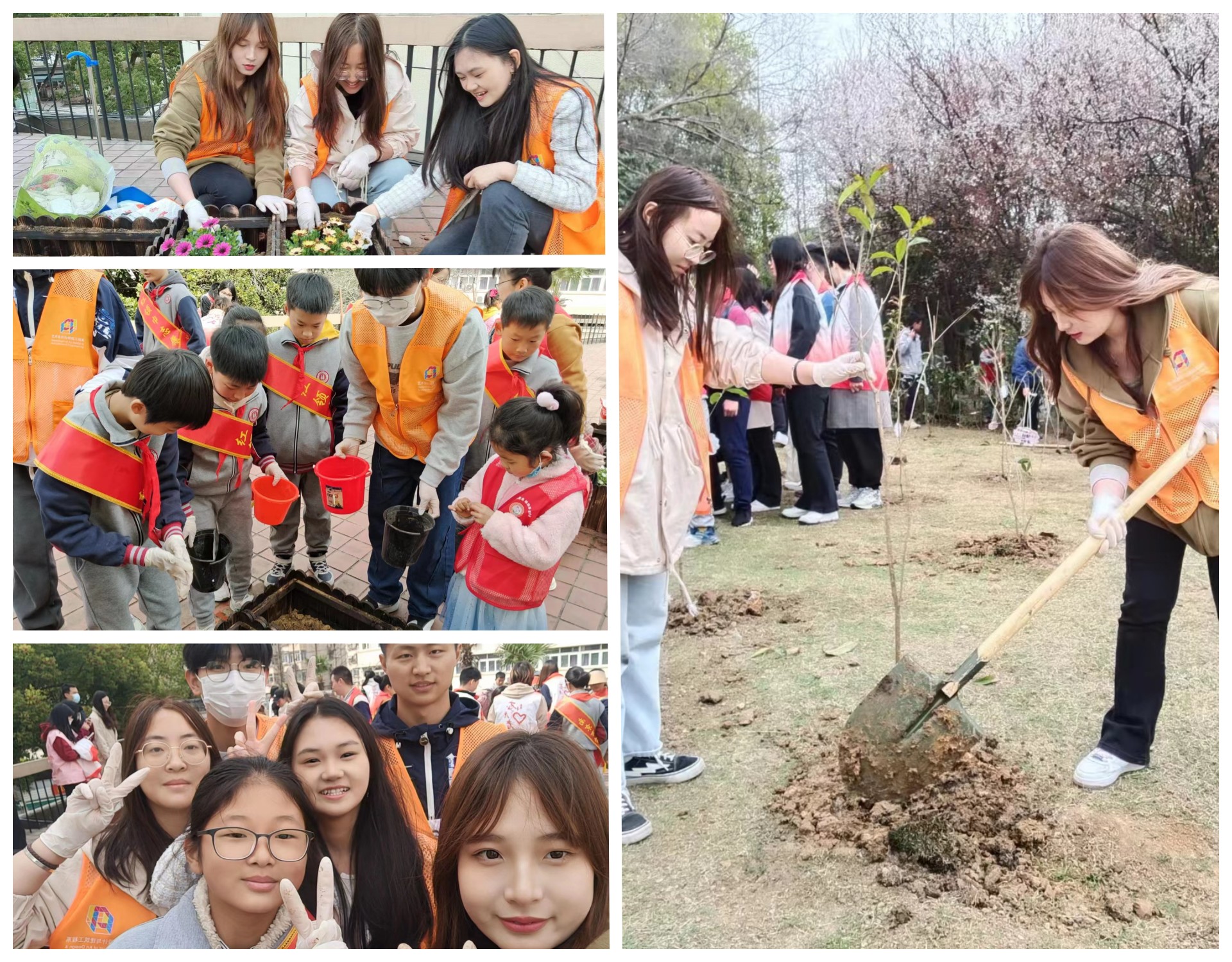 3月13日活动当天,同学们组成志愿小队前往上怡新村社区开展志愿服务。在与社区负责人进行简单的对接之后,同学们纷纷投入到志愿服务中去。在活动现场同学们有的安装花盆,有的搅拌土壤,撕泡沫板并联合当地中小学的小朋友们一起开展“大手拉小手共筑绿色梦”的小活动,跟小朋友们一起种花,植树。