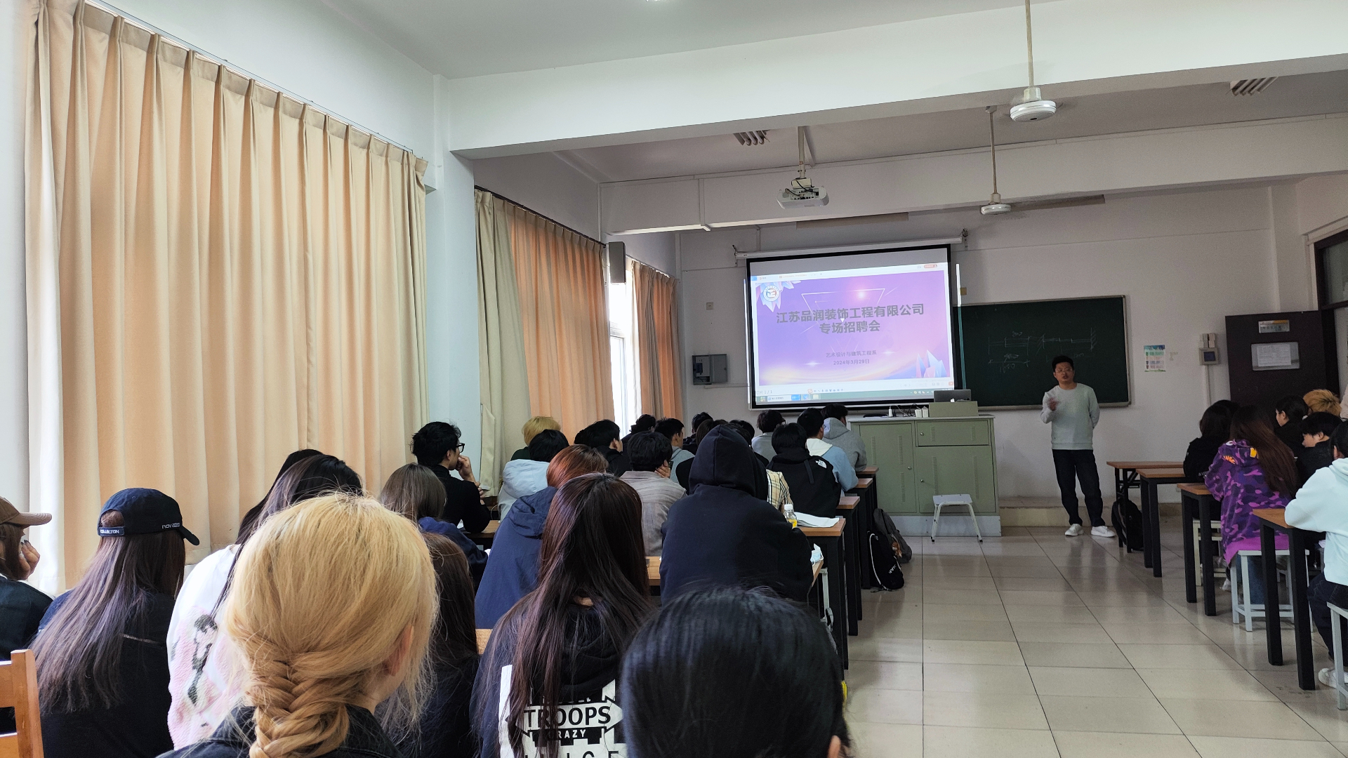 3月29日,江苏品润装饰工程有限公司走进艺术设计与建筑工程系,举办了一场别开生面的企业宣讲会。此次活动旨在加强企业与学校之间的合作,为艺术设计与建筑工程系的学生提供更多了解行业、拓展职业视野的机会,同时也为企业选拔优秀人才搭建了一个良好的平台。