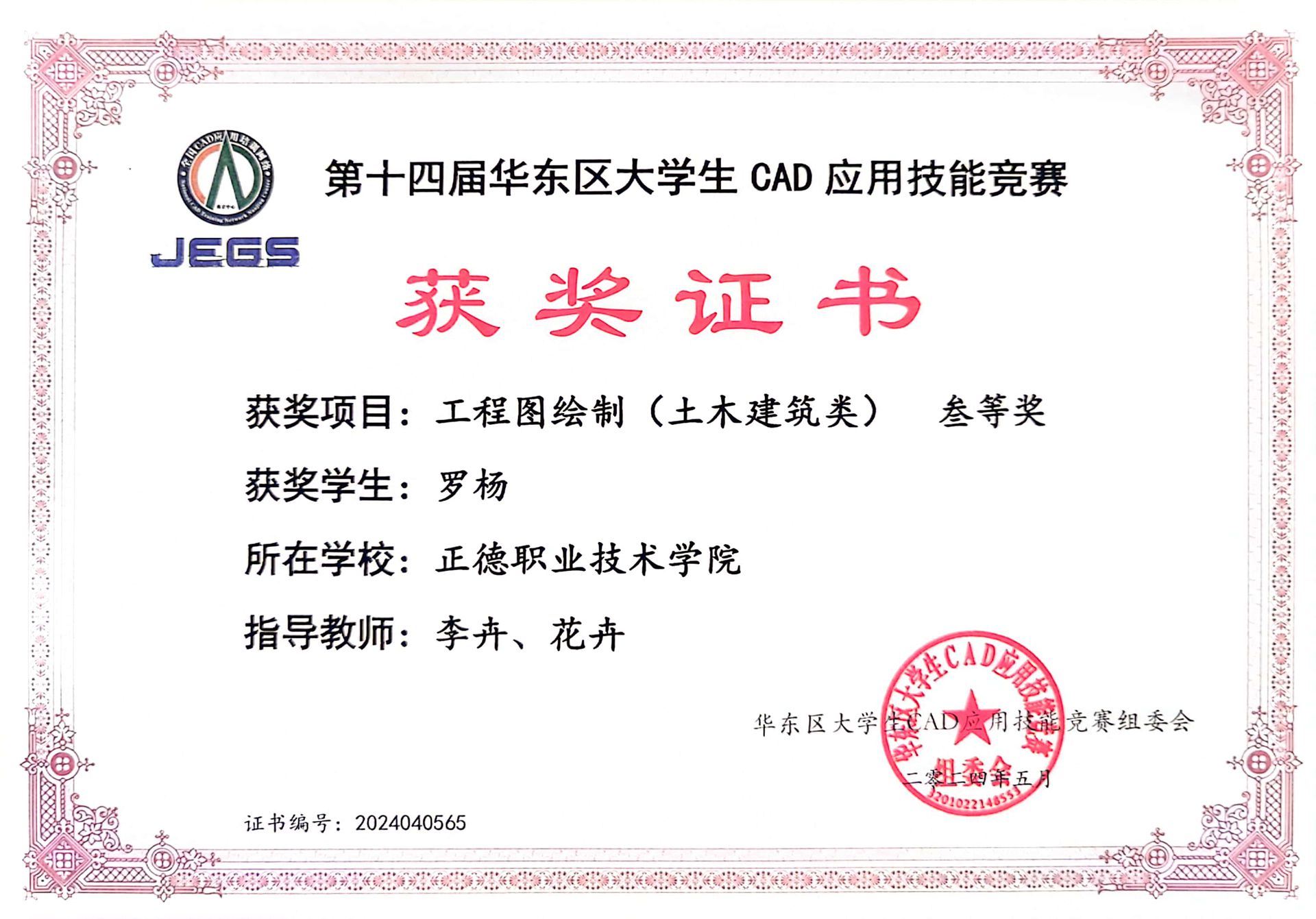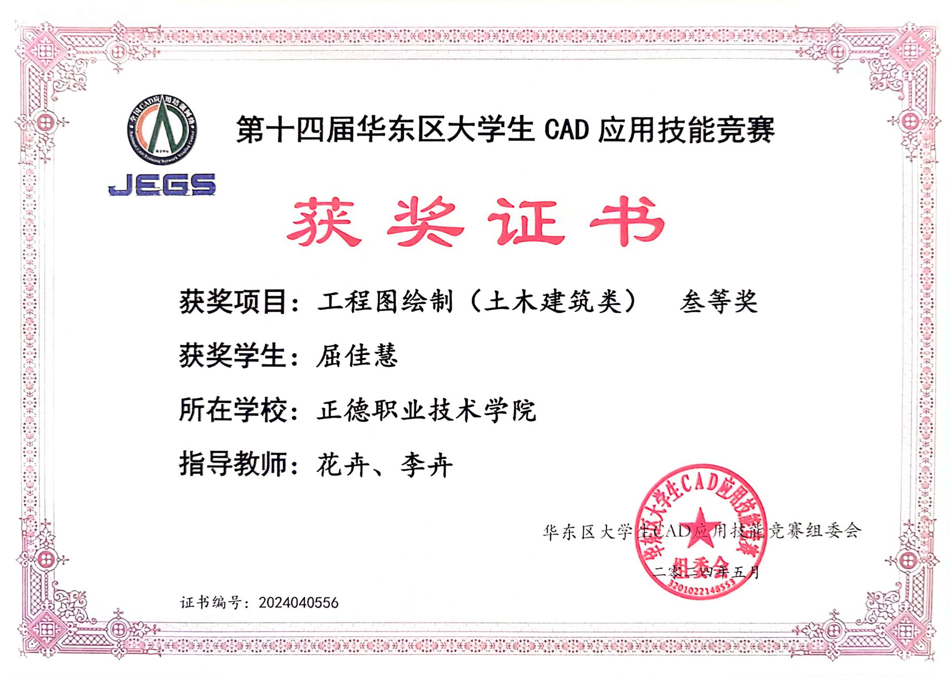 5月18日,由全国CAD应用培训网络-南京中心、江苏省工程图学学会主办,东南大学承办的第十四届华东区大学生CAD应用技能竞赛成功举办。艺术设计与建筑工程系工程造价专业学生在工程图绘制(土木建筑类)赛道中获得三等奖3项。