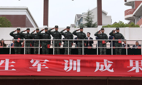 2300余名新生集结在田径场,他们军容严整,目光坚毅,接受全院师生的检阅。军训汇报表演在庄严的国歌声中拉开了帷幕,总指挥唐峰请学院领导检阅训练成果,院长庄群华下达“开始!”命令。
