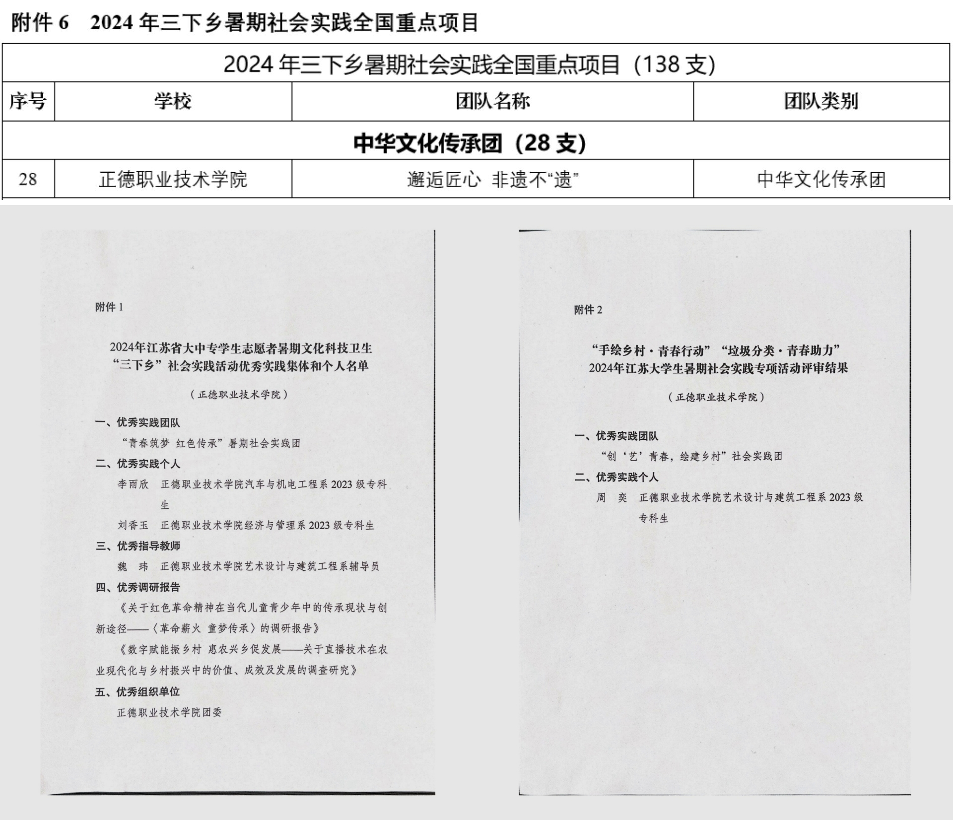 院团委荣获2024年江苏省“三下乡”社会实践活动优秀组织单位;电子与信息技术系“青春筑梦,红色传承”实践团、艺术设计与建筑工程系“创‘艺’青春,绘建乡村”实践团荣获2024年江苏省“三下乡”社会实践活动优秀实践团队;艺术设计与建筑工程系辅导员魏玮老师荣获2024年江苏省“三下乡”社会实践活动优秀指导教师;经济与管理系《数字赋能振乡村 惠农兴乡促发展——关于直播技术在农业现代化与乡村振兴中的价值、成效及发展的调查研究》、基础教育系《关于红色革命精神在当代儿童青少年中的传承现状与创新途径——<革命薪火 童梦传承>的调研报告》荣获2024年江苏省“三下乡”社会实践活动优秀调研报告;经济与管理系刘香玉同学、艺术设计与建筑工程系周奕同学、汽车与机电工程系李雨欣同学荣获2024年江苏省“三下乡”优秀实践个人。