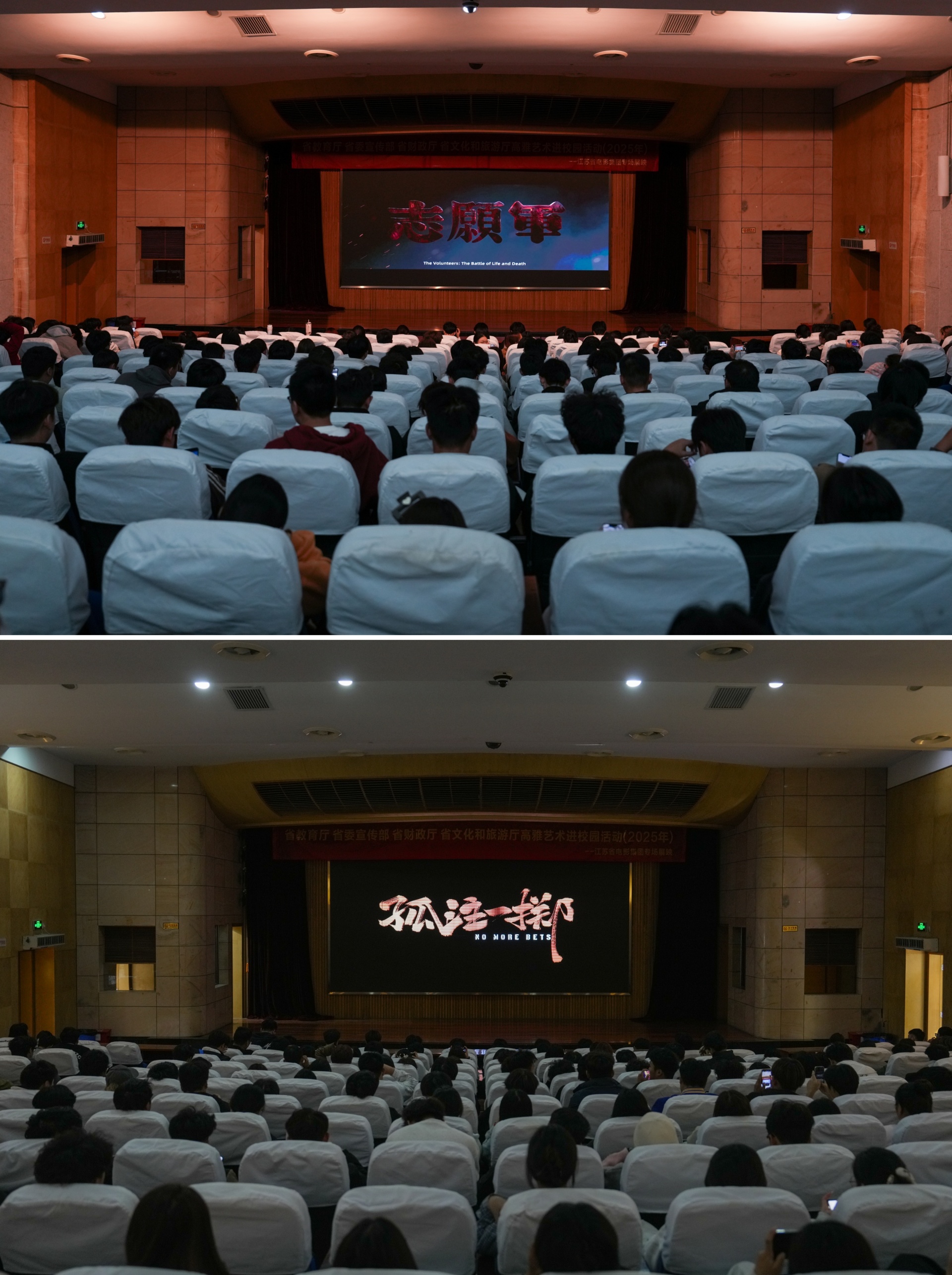 为深入推进校园文化建设,深化爱国主义教育,发挥优秀影视作品的思想引领作用,10月23日下午,春满四合院 联合江苏省电影集团在报告厅举办“青春光影 逐梦未来”主题电影专场放映活动。本次活动精选两部兼具思想深度与艺术价值的影片《孤注一掷》《志愿军:存亡之战》,通过光影艺术为师生呈现了一场震撼心灵的精神盛宴,吸引近七百名师生到场观影,其中《志愿军:存亡之战》以其厚重的历史底蕴和强烈的情感共鸣,成为全场瞩目的焦点。