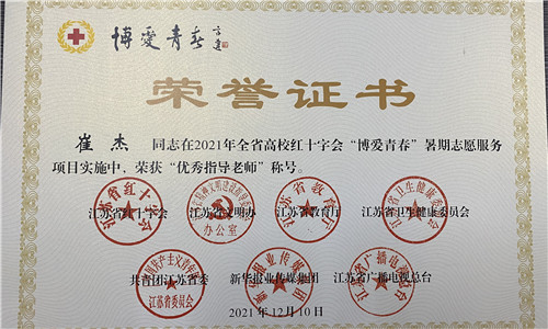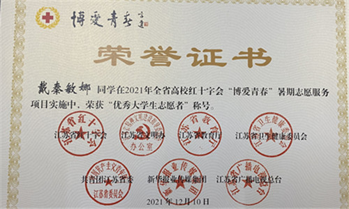 近日,江苏省红十字会、江苏省教育厅、共青团江苏省委等单位联合印发《关于2021年全省高校红十字会“博爱青春”暑期志愿服务项目实施情况的通报》。经过前期激烈的网络评审、现场项目汇报环节,我院红十字会“留下温暖、守护成长”项目荣获“江苏省高校红十字会‘博爱青春’暑期志愿服务优秀项目”,艺术设计与建筑工程系团总支书记崔杰获评优秀指导教师,院红十字会会员戴秦敏娜获评优秀大学生志愿者。项目同时荣获南京高校红十字会“博爱青春”暑期志愿服务活动二等奖。