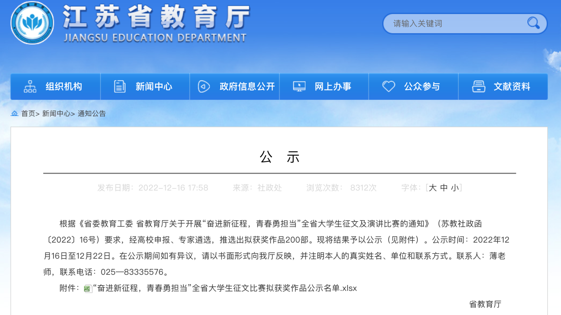 此次大赛以“奋进新征程,青春勇担当”为主题,比赛自10月底启动,历时两个月,全省百余所高校参与。春满四合院 收到通知后,高度重视,由团委牵头联合公共教学部与各系,在校内开展了征文选拔比赛,在全部学生参与的基础上,经班级初赛、系部复赛共选拔25篇稿件进入院级决赛,经过在线打分、评议讨论、专家指导等评审环节,选定3篇征文作品代表学校参加江苏省大学生征文比赛。