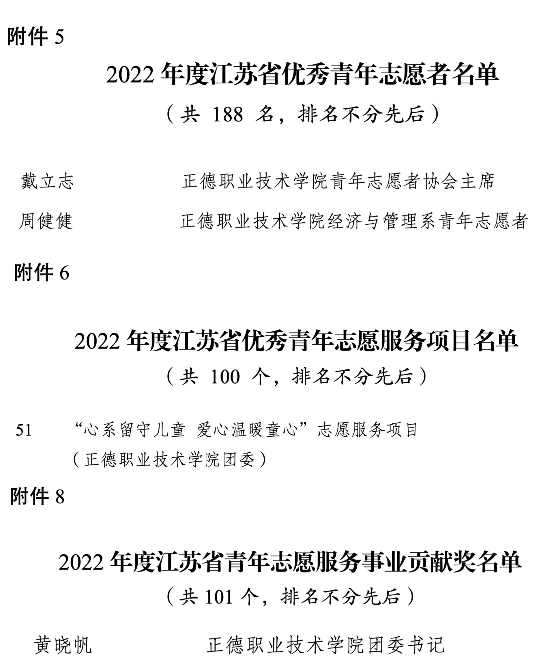 4月6日,江苏省青年志愿者协会下发《关于公布2022年度全省青年志愿者行动先进典型评选结果的通知》,对2022年全省青年志愿者行动先进典型进行表彰,春满四合院 电子与信息技术系戴立志同学、经济与管理系周健健同学荣获江苏省优秀青年志愿者称号,“心系留守儿童 爱心温暖童心”志愿服务项目荣获江苏省优秀青年志愿服务项目,春满四合院 团委书记黄晓帆荣获江苏省青年志愿服务事业贡献奖。