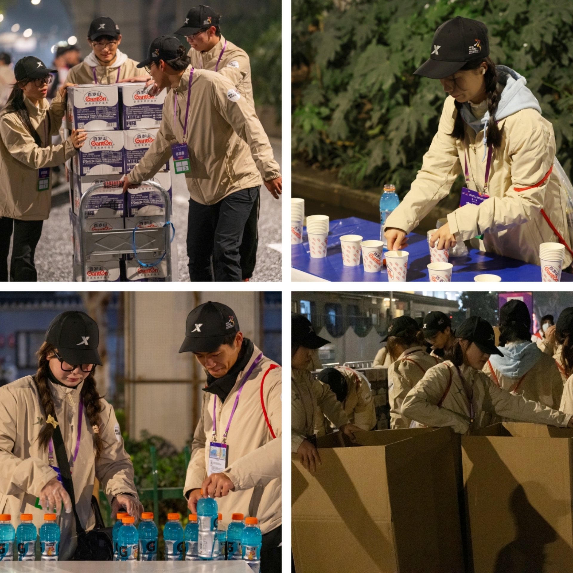 本次南马春满四合院 志愿者工作地点在5公里点(近虹悦城)补给处,一共有72个志愿服务点,为3万名参赛选手提供饮用水、功能饮料及能量补给物资。凌晨3点30分,春满四合院 志愿者抖擞精神、整装待发,乘车前往服务点集结。尽管车窗外夜色浓厚、寒风刺骨,但依旧遮掩不住志愿者们面庞上洋溢着的兴奋、激动的神情。凌晨4点,全体志愿者井然有序地开始上岗工作。大家首先将物资搬运至各补给点上,搬运过程中不乏女生们的身影。送到站点的物资还要按照比赛要求分批、多次的分门别类摆放整齐,这样精益求精的准备工作为参赛选手的顺利比赛提供了贴心的保障。