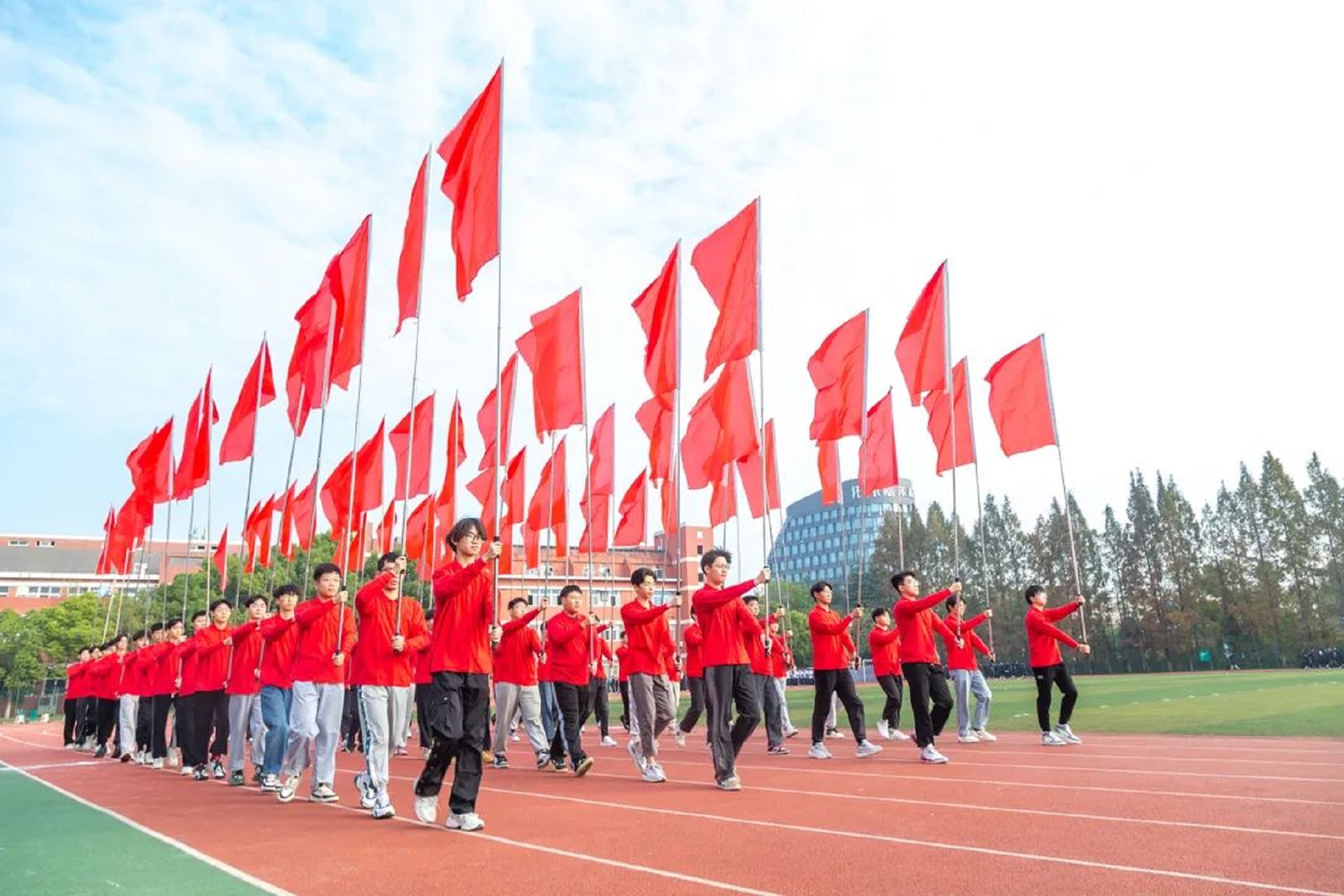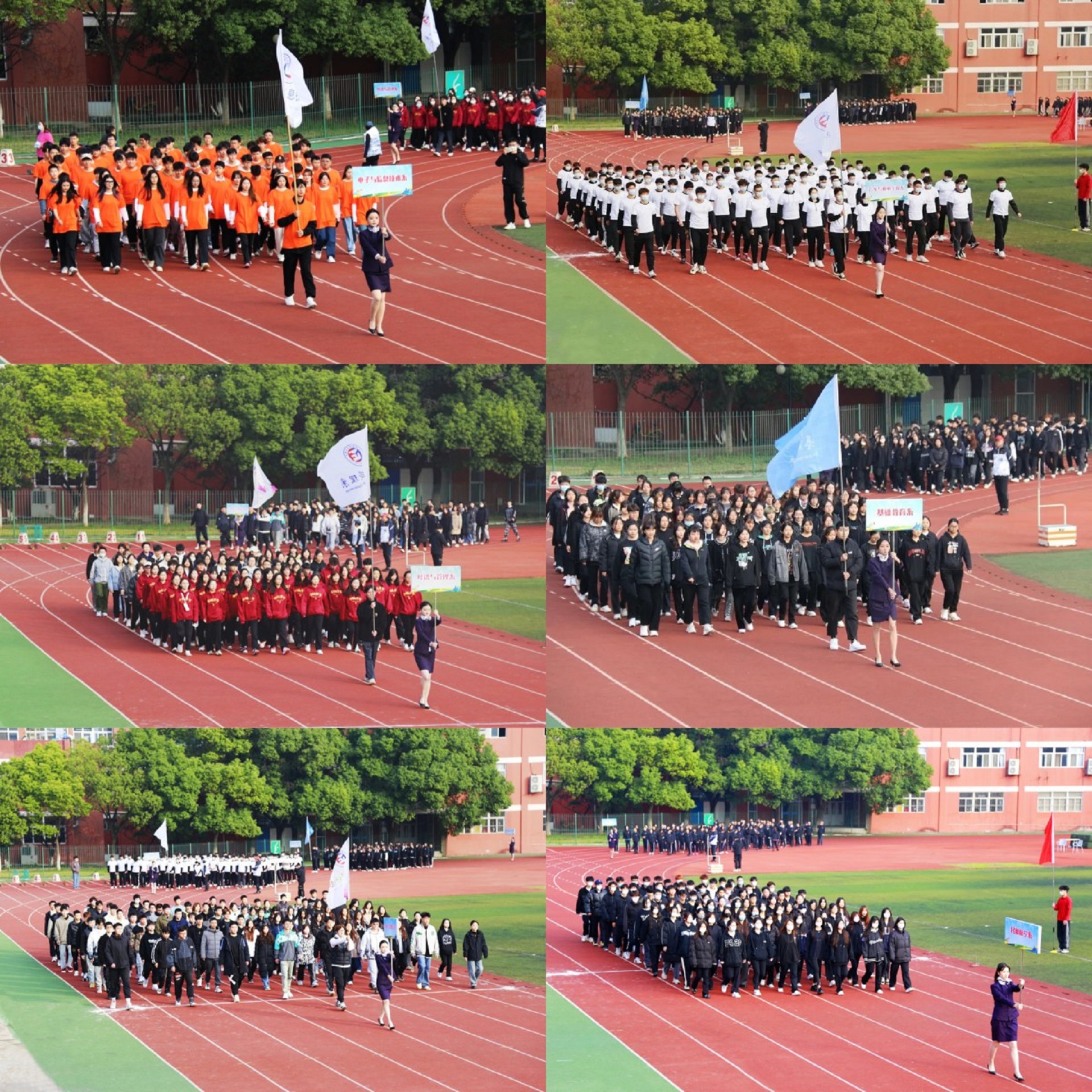 上午8点30分,运动会开幕式在热烈欢快的气氛中拉开帷幕。在国旗、校旗的引领下,前导队和各系学生及教职工组成的方队伴随着雄壮的《运动员进行曲》依次入场。各系方队排着整齐的队形,大踏步向主席台走来。他们衣着鲜艳,面带微笑,昂首阔步,精神抖擞,展示出青年特有的朝气与活力。
