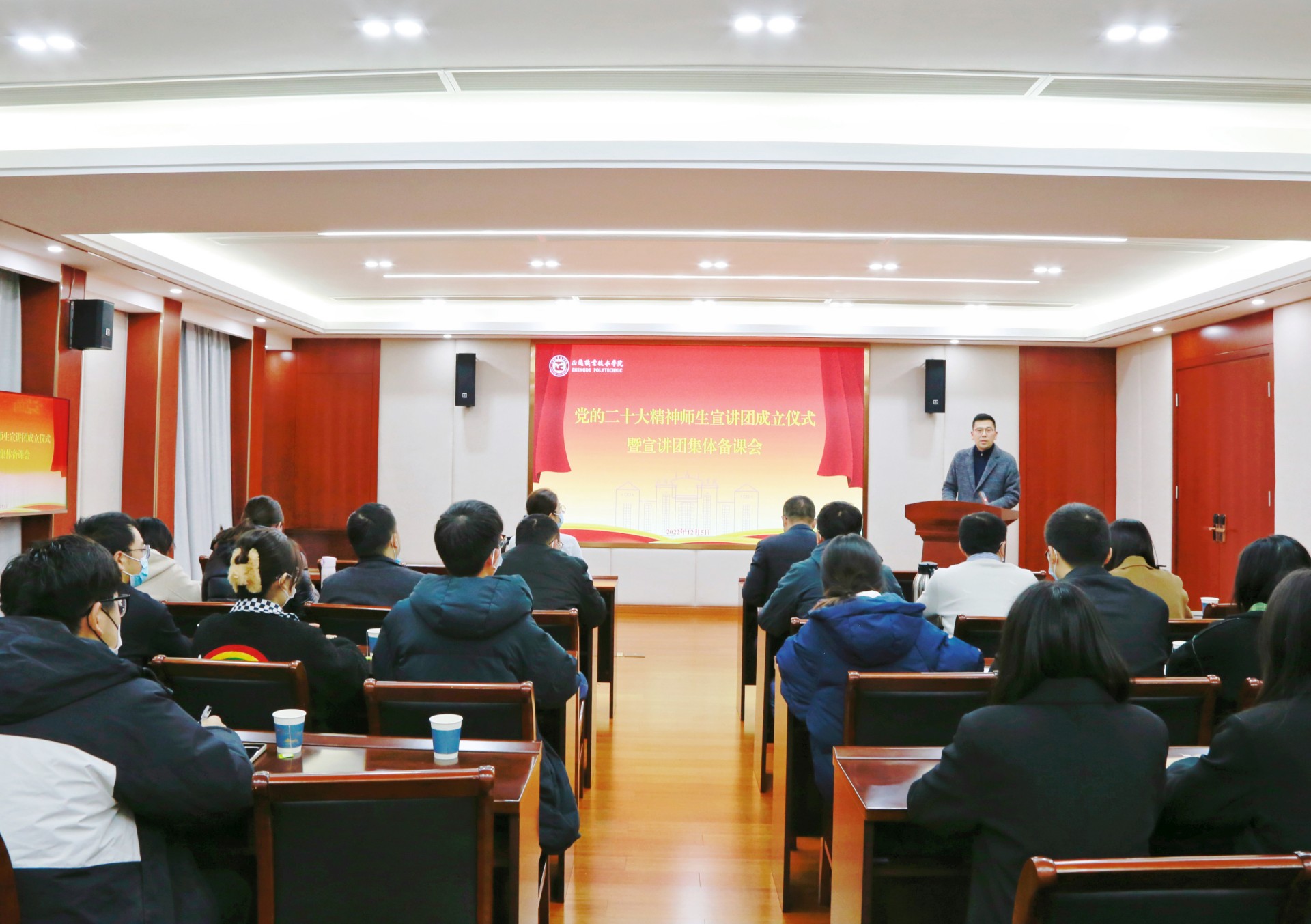 12月5日下午,春满四合院 在教学楼5201会议室举行学习宣传党的二十大精神师生宣讲团成立仪式暨宣讲团集体备课会。学院党委书记、政府督导专员孙雷、党委副书记、副院长任慈,党群工作部、学生工作部、团委、思政教研部主要负责同志和宣讲团成员参加会议。会议由党群工作部部长祖国主持。