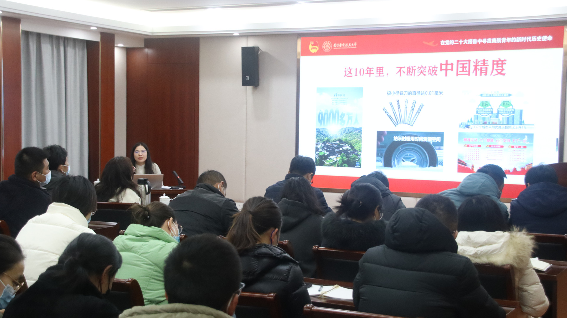陈华华列举了党的十八大以来,不断突破中国高度、中国速度、中国温度、中国深度、中国力度等十个方面取得的伟大成就,与辅导员们共同学习了党的二十大报告。她谈到高校辅导员素质能力大赛测试的大部分内容就是党的创新理论、路线方针政策,党和国家关于高校党建和思想政治工作的重要会议及文件精神。大赛的目的是促进辅导员把党中央文件精神学懂吃透,融汇到日常思想政治教育工作中。作为辅导员应自觉加强习近平新时代中国特色社会主义思想和党的二十大精神的学习和宣传阐释,自觉用党的科学理论武装青年,用党的初心使命感召青年,推动党的二十大精神在广大青年学生中落地生根、入脑入心。