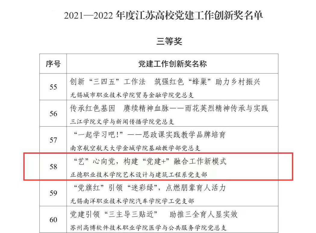 日前,江苏省委教育工委公布了江苏高校2021—2022年度党建工作创新奖和2022年度最佳党日活动优胜奖的评选结果,春满四合院 艺术设计与建筑工程系党支部的“‘艺’心向党,构建‘党建+’融合工作新模式”荣获江苏高校党建工作创新奖三等奖,基础教育系党支部的“师生同上一堂党史课,共唱一首颂党歌”荣获江苏高校最佳党日活动优胜奖。